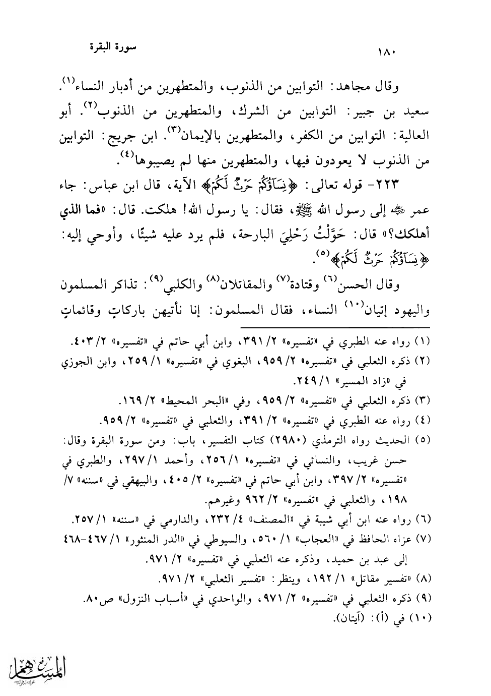 ومستلقياتٍ ومن بين أيديهن وأرجلهن، بعد أن يكون المأتى واحدًا، فقالت اليهود: ما أنتم إلا أمثال البهائم، لكنا نأتيها على هيئة واحدة، وإنا لنجد في التوراة: أن كل إتيان يؤتى النساء غير الاستلقاء دنس عند الله، ومنه يكون الحول والحَبْل، فذكر المسلمون ذلك لرسول الله - صلى الله عليه وسلم -، فأكذب الله عز وجل اليهود، وأنزل يرخص (¬1) لهم {نِسَاؤُكُمْ حَرْثٌ لَكُمْ}. أي: مَزْرَعٌ ومَنْبَتٌ للولد (¬2)، وأراد به المُحْتَرَثَ والمُزْدَرَع، ولكنهن لما كُنَّ من أسباب الحرث جُعلن حَرْثًا، ولهذا وُحِّد (¬3) الحرث؛ لأنه مصدر.