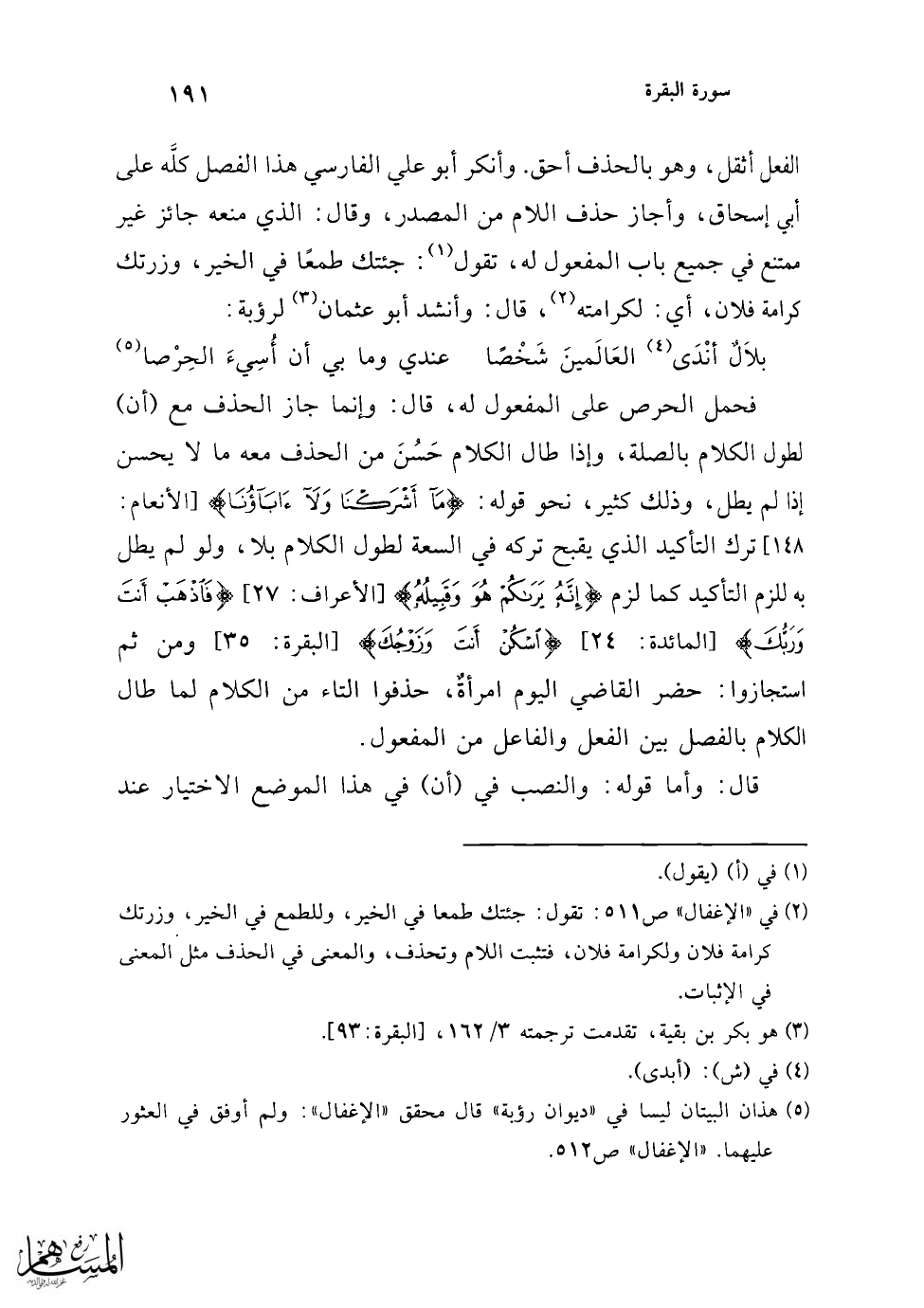 وهذا الذي ذكره أبو إسحاق من رفع (أن) تقدير (¬4) زائد على ما ذكرنا من التقديرات في (أن)، لأن الكلام على هذا يصير مستأنفًا لا تعلق له بما قبله، والتقديرات السابقة توجب (¬5) التعلق بما سبق (¬6).