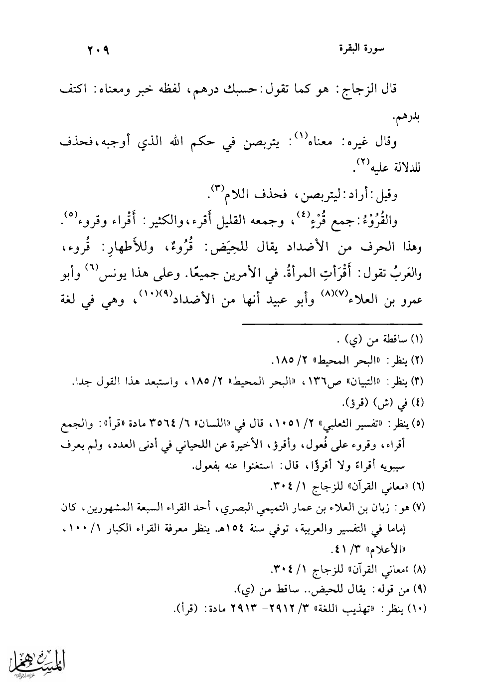 (¬3) ينظر في القرء: "معاني القرآن" للأخفش 1/ 174 - 175، "معاني القرآن" للزجاج 1/ 302 - 304، "تهذيب اللغة" 3/ 2912 - 2914 مادة (قرأ)، "المفردات" ص 399 - 400، "عمدة الحفاظ" 3/ 338 - 340، "اللسان" 6/ 3564 - 3565 مادة (قرأ).