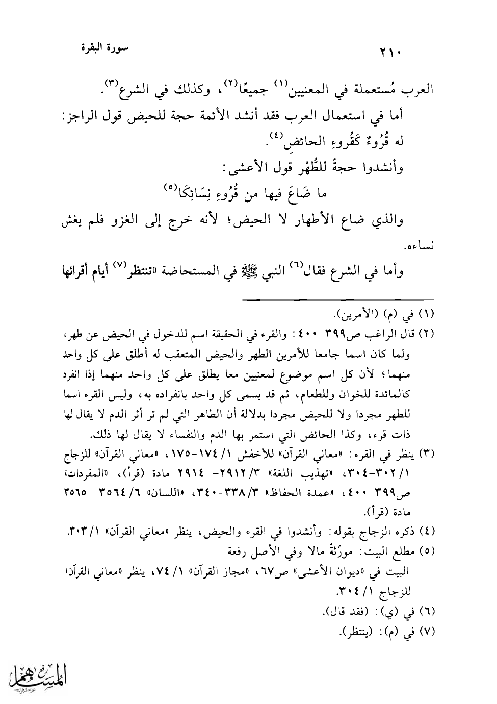 (¬6) "تفسير مجاهد" 1/ 108، ورواه الطبري في "تفسيره" 2/ 439، "ابن أبي حاتم" في "تفسيره" 2/ 415.