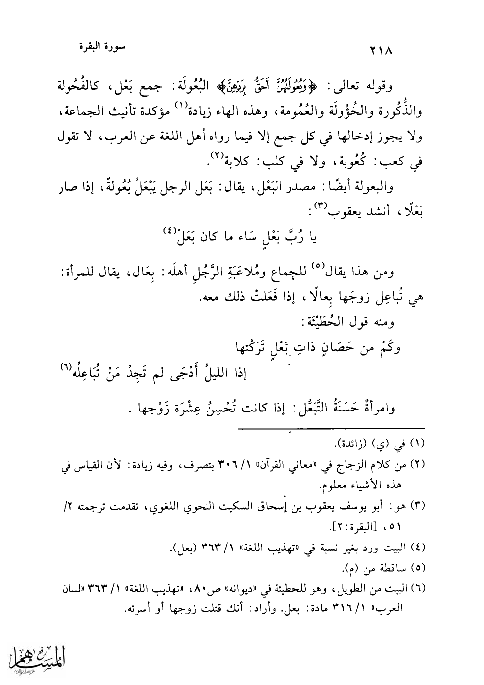 (¬2) ينظر في مادة: بعل "معاني القرآن" للزجاج 1/ 306، "تهذيب اللغة" 1/ 316، "تفسير الثعلبي" 2/ 1066، "المفردات" 64 - 65، "اللسان" 1/ 362 - 363. قال الراغب: ولما تُصور من الرجل الاستعلاء على المرأة فجعل سائسها والقائم عليها كما قال تعالى: {الرِّجَالُ قَوَّامُونَ عَلَى النِّسَاءِ}، سمي باسمه كلُّ مستعل على غيره، فسمى العرب معبودهم الذي يتقربون به إلى الله بعلا؛ لاعتقادهم ذلك فيه، نحو قوله تعالى: {أَتَدْعُونَ بَعْلًا وَتَذَرُونَ أَحْسَنَ الْخَالِقِينَ}، ويقال: أتانا بعل هذه الدابة، أي المستعلي عليها، وقيل للأرض المستعلية على غيرها بعل.