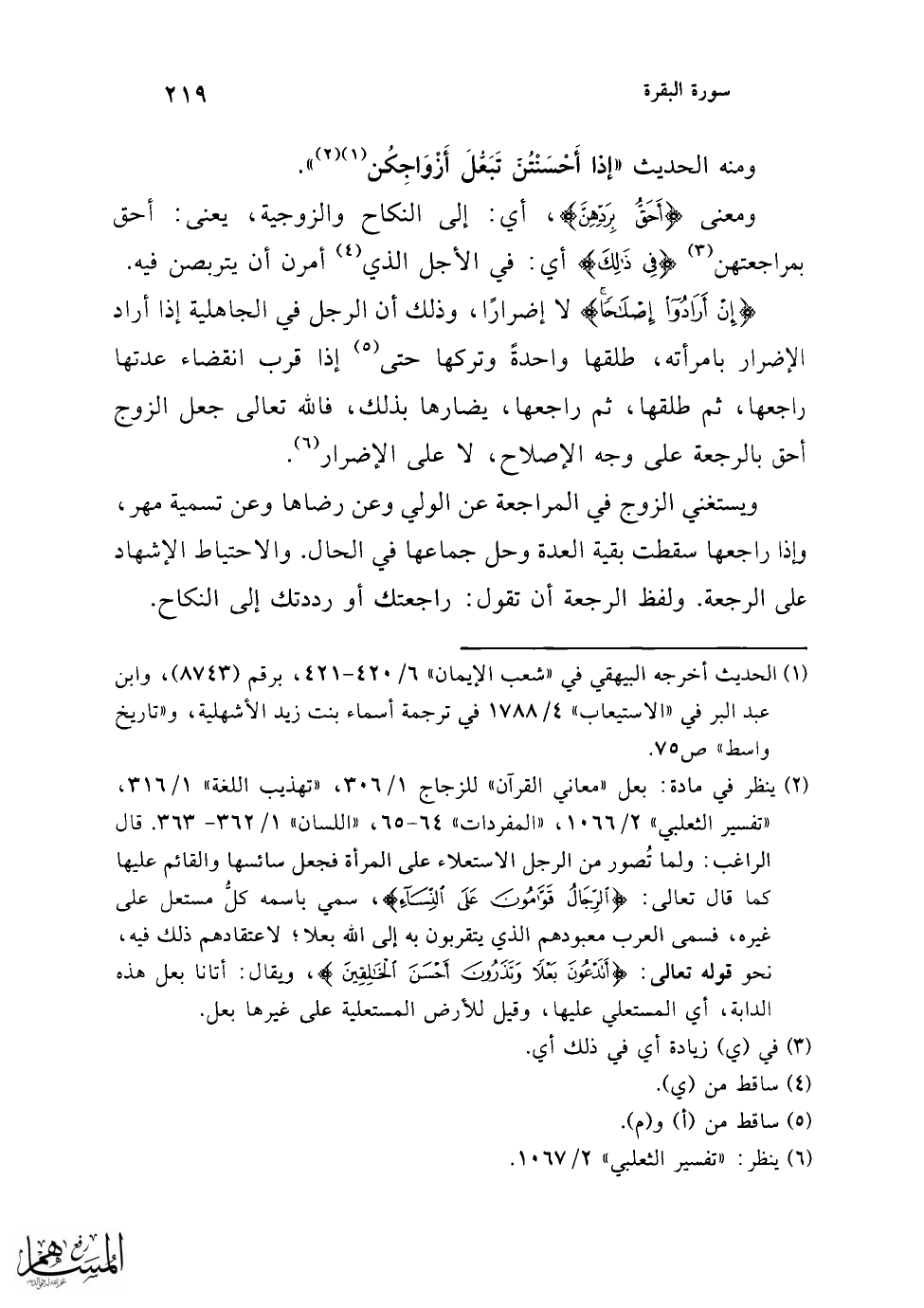 وقوله تعالى: {وَلَهُنَّ مِثْلُ الَّذِي عَلَيْهِنَّ بِالْمَعْرُوفِ} أي: للنساء على الرجال مثل الذي للرجال عليهن من الحق {بِالْمَعْرُوفِ} أي: بما أمر الله به من حق الرجل على المرأة (¬1). روي عن ابن عباس أنه قال: إني لأتزين لامرأتي كما تتزين لي لقوله تعالى: {وَلَهُنَّ مِثْلُ الَّذِي عَلَيْهِنَّ بِالْمَعْرُوفِ} مثل الذي عليهن بالمعروف (¬2).
