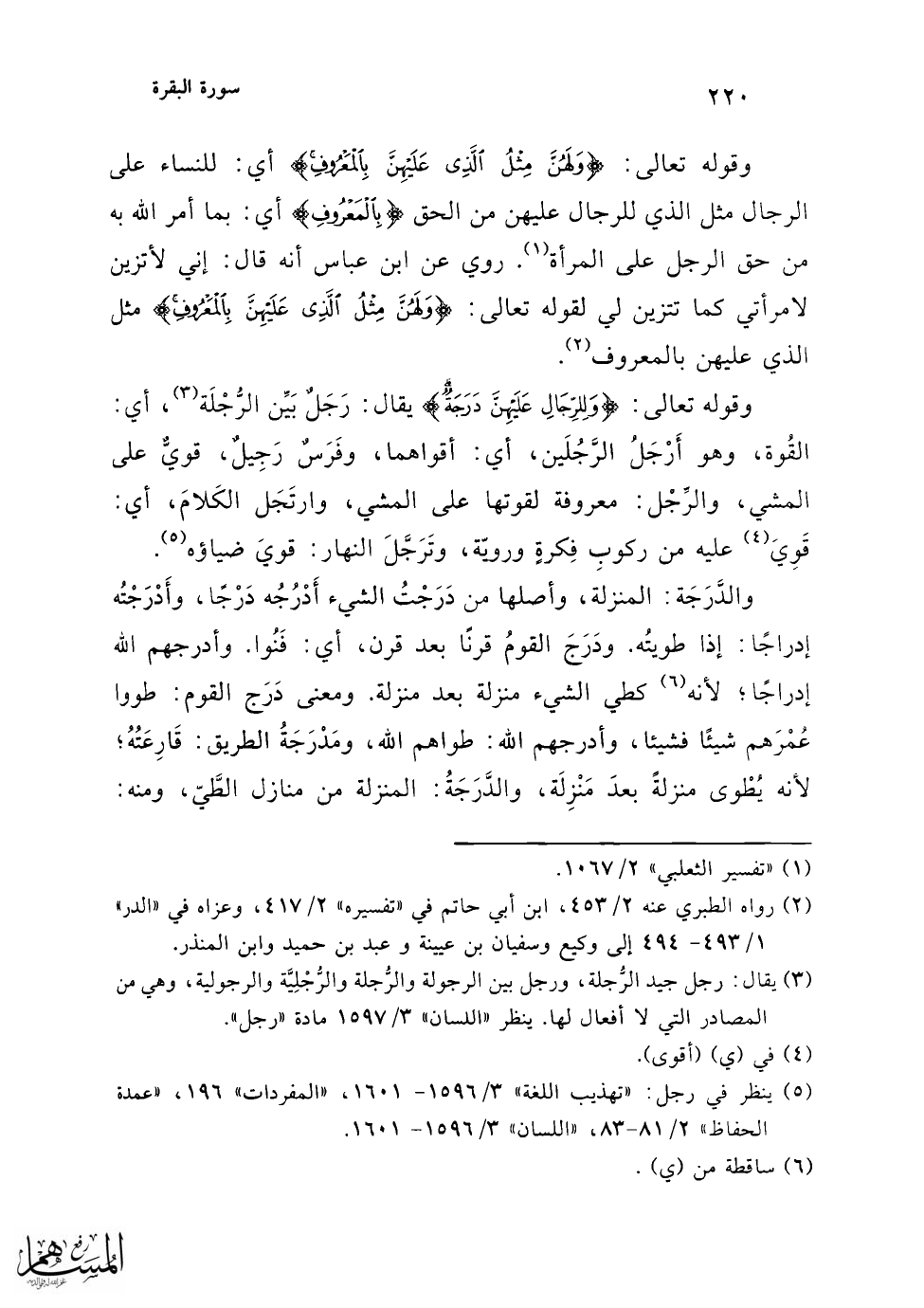 (¬2) ينظر في درج: "تهذيب اللغة" 2/ 1167، "المفردات" ص 174، "اللسان" 3/ 1351. قال الراغب: الدَّرَجة نحو المنزلة، لكن يقال للمنزلة: درجة، إذا اعتبرت بالصعود دون الامتداد على البسيط كدرجة السطح والسلم، ويعبر بها عن المنزلة الرفيعة، قال تعالى: {وَلِلرِّجَالِ عَلَيْهِنَّ دَرَجَةٌ}.