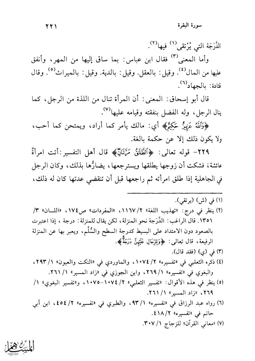 والمرة من المرور والمرِّ أيضًا، يقال: المَرّةُ الأُولى، والمَرُّ (¬4) الأوَّلُ. وقال أهل المعاني: الآية مختصرة معناها: الطلاق الذي يملك فيه الرجعة مرتان (¬5).