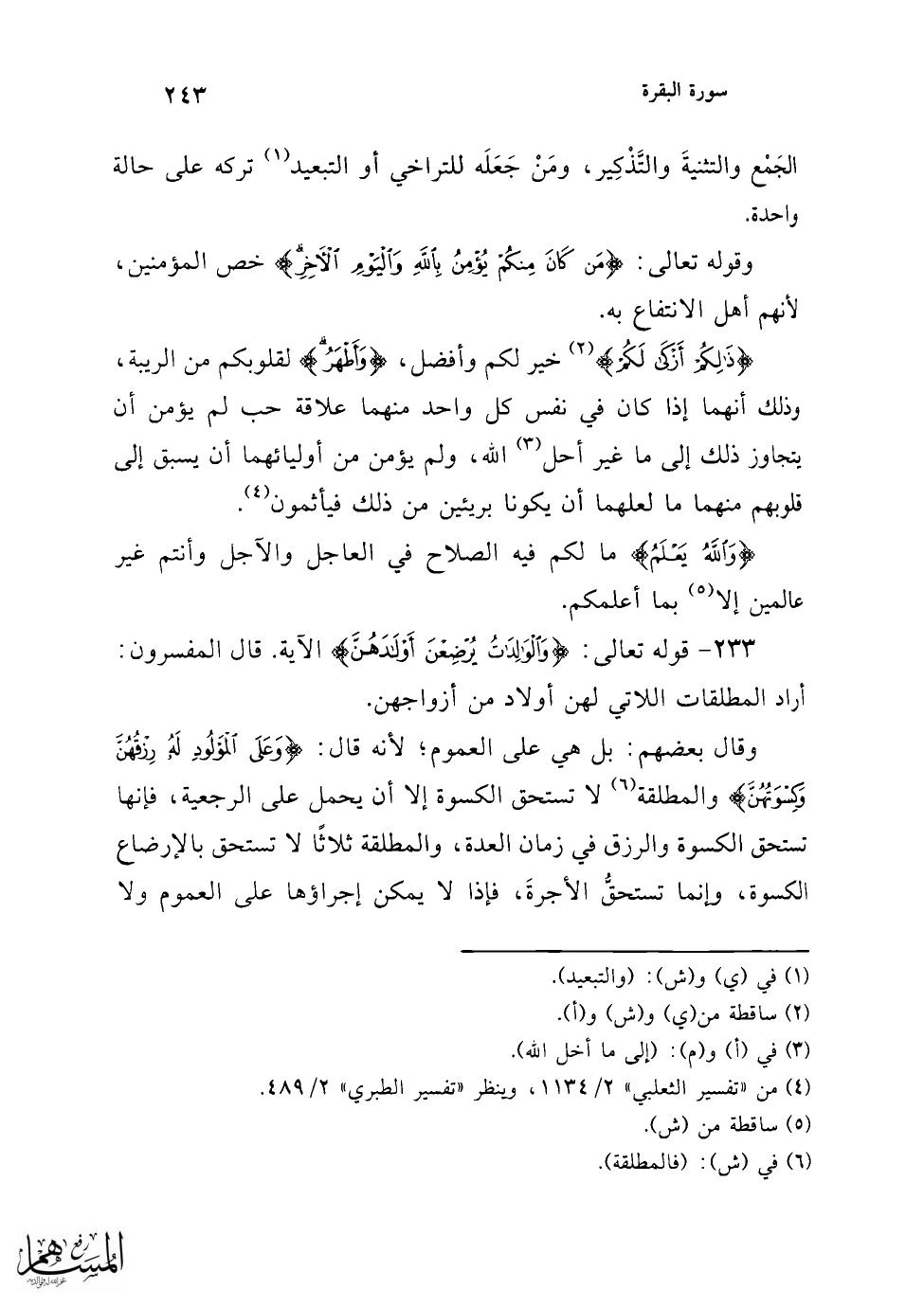 فإنْ قيل: إذا كانت الزوجية باقية فهي تستحق الرزق والكسوة بسبب النكاح، سواء أرضعت له ولده أو امتنعت، فما وجه تعليق هذا الاستحقاق بالإرضاع؟ قلنا: النفقة والكسوة في مقابلة التمكين، وإذا اشتغلت بالإرضاع والحضانة ربما لا تمكن من كمال التمكين، فيتوهم متوهم أن نفقتهما وكسوتها تسقط بالخلل الواقع في التمكين، فقطع الله ذلك التوهم بإيجاب الرزق والكسوة، وإن اشتغلت المرأة بالإرضاع، ولهذا قلنا: إذا أشخصها زوجها إلى سفر لحاجته وتجارته فنفقة سفرها عليه؛ لأنها مشغولة بشغله، وإذا كان كذلك فالرزق والكسوة هاهنا لا يكون أجرة الرضاع، وأجرة الرضاع تجب على الزوج بقوله تعالى: {فَإِنْ أَرْضَعْنَ لَكُمْ فَآتُوهُنَّ أُجُورَهُنَّ} [الطلاق: 6] وفائدة ذكر الرزق والكسوة في هذه الآية ما بينا (¬2).