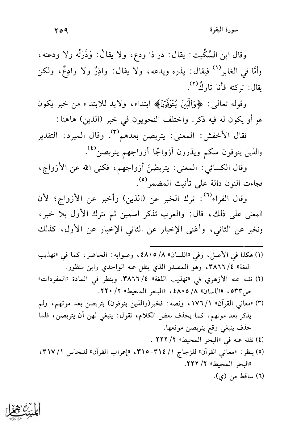 قال أبو إسحاق: وهذا القول غير جائز، لا يجوز أن يبتدأ بالاسم ولا يحدث عنه؛ لأن الكلام إنما وضع للفائدة، فما لا يفيد فليس بصحيح، والذي هو الحق في هذه المسألة: أن ذكر الذين قد جرى ابتداء، وذكر الأزواج قد جرى متصلا بصلة الذين، فصار الضمير الذي في (يتربصن) يعود على الأزواج مضافات إلى الذين، كأنك قلت: يتربصن أزواجهم. قال: ومثل هذا من الكلام: الذي يموت ولخلف ابنتين ترثان الثلثين، المعنى: ترث ابنتاه الثلثين (¬4).