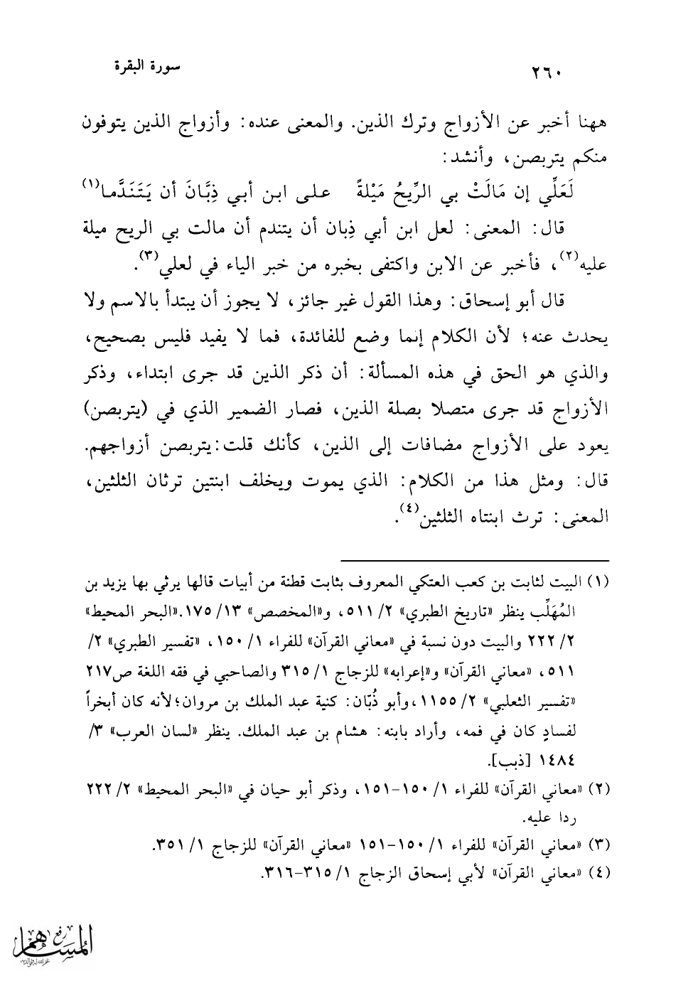 وهذا الذي ذكره أبو إسحاق هو قول أبي العباس بعينه، إلا أنه مَثَّل مثالًا لا يليق بما قدَّمه من الكلام والتقدير؛ لأنه مثل بالفعل والفاعل، وكان ينبغي أن يمثل بالمبتدأ والخبر، ألا ترى أنه قال: فصار الضمير الذي في يتربصن يعود على الأزواج مضافات إلى الذين، وإذا كان كذلك، وجب أن يكون ما يرجع إليه الضمير الذي في (يتربصن) يرتفع بالابتداء، وإذا ارتفع بالابتداء (¬1)، وجب أن يمثل بالابتداء، ليكون المثال مطابقًا للوصف، فيقول بدل قوله: يتربصن أزواجهم، أزواجهم يتربصن، وكذلك: الذي يموت ويخلف ابنتين يرثان الثلثين (¬2).