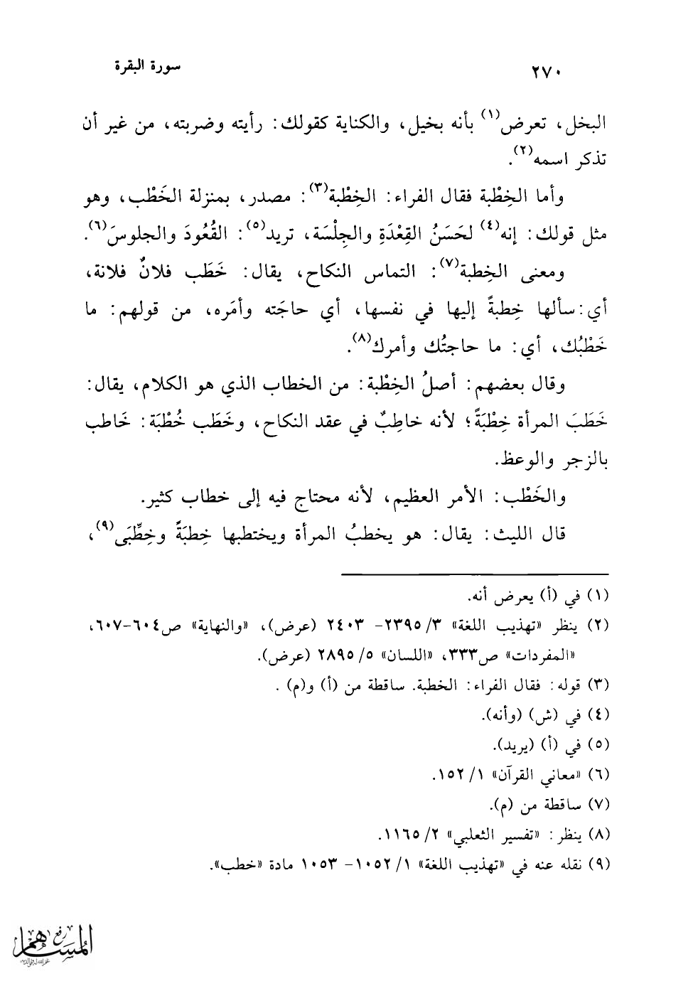(¬3) ينظر في خطب "معاني القرآن" للأخفش 1/ 373، "تهذيب اللغة" 1/ 1053 (خطب)، "تفسير الثعلبي" 2/ 1165، "المفردات" ص 157، "اللسان" 2/ 1194 - 1195 (خطب)، قال في المفردات: وأصل الخِطبة. الحالة التي عليها الإنسان إذا خطب، نحو الجلسة والقِعدة، ويقال من الخُطبة: خاطب وخطيب، ومن الخِطبة: خاطب لا غير، والفعل منهما خطب.