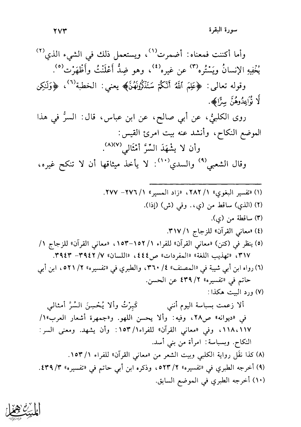 ونحو هذا قال عطاء عن ابن عباس في قوله: {وَلَكِنْ لَا تُوَاعِدُوهُنَّ سِرًّا} قال: يريد الجماع، يقول لها: أنا راغب فيك، دعيني أجامعك حتى إذا وفيتِ عِدَّتَك أظْهَرْتُ نِكَاحَكِ (¬8). وقال الكلبي: معناه: لا تصفوا أنفسكم لهن بكثرة الجماع (¬9)، وعلى هذا القول السر: الجماع نفسه (¬10).