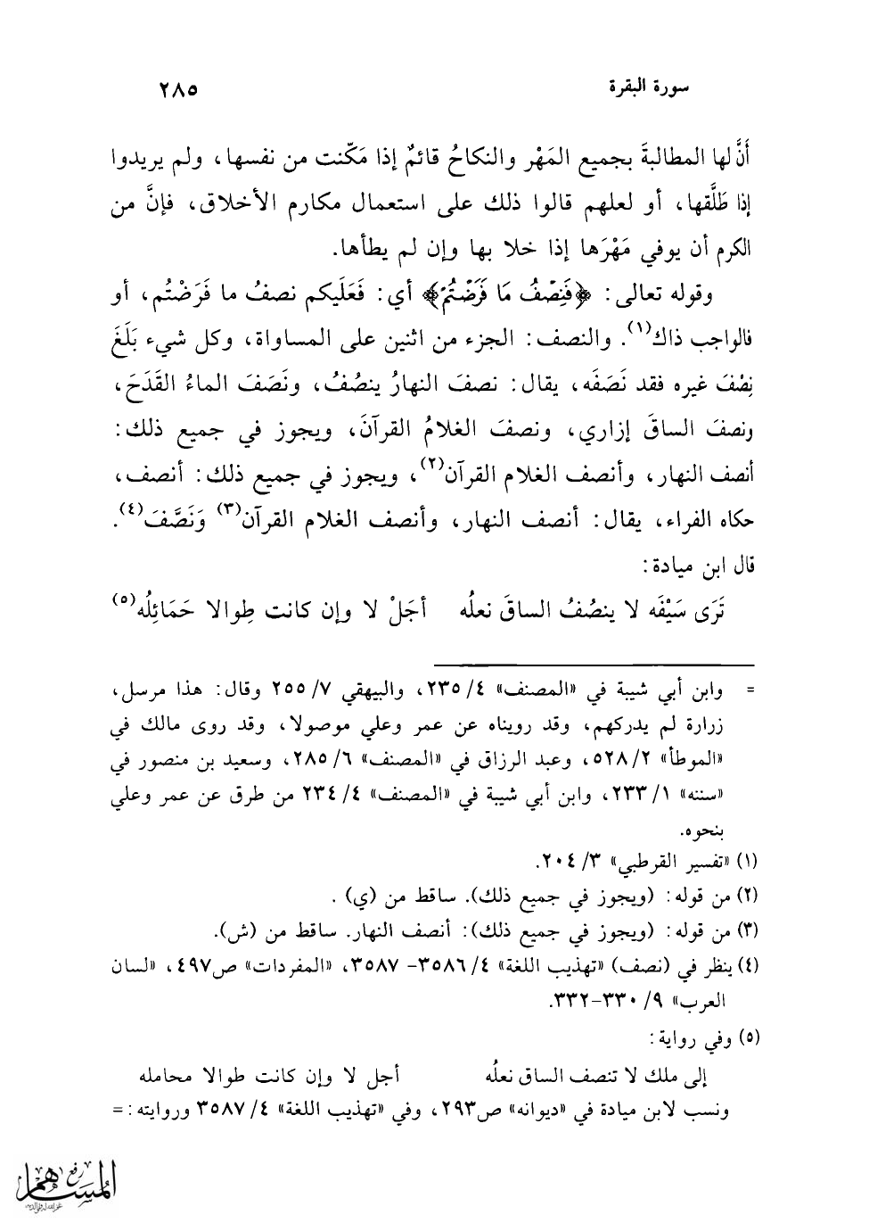 ومعنى {إِلَّا أَنْ يَعْفُونَ} إلا أن يترك النساء ذلك النصف فلا يطالبن الأزواج به، إذا كُنَّ بالغاتٍ رشيداتٍ، فيسقطُ عن الرجل أو بعضه، فيسقط ذلك القدر (¬6).