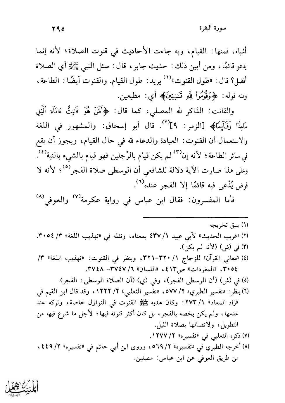 والوالبي (¬1): {وَقُومُوا لِلَّهِ قَانِتِينَ} أي: مطيعين. وهو قول الشعبي (¬2) وعطاء (¬3) والحسن (¬4) وقتادة (¬5).