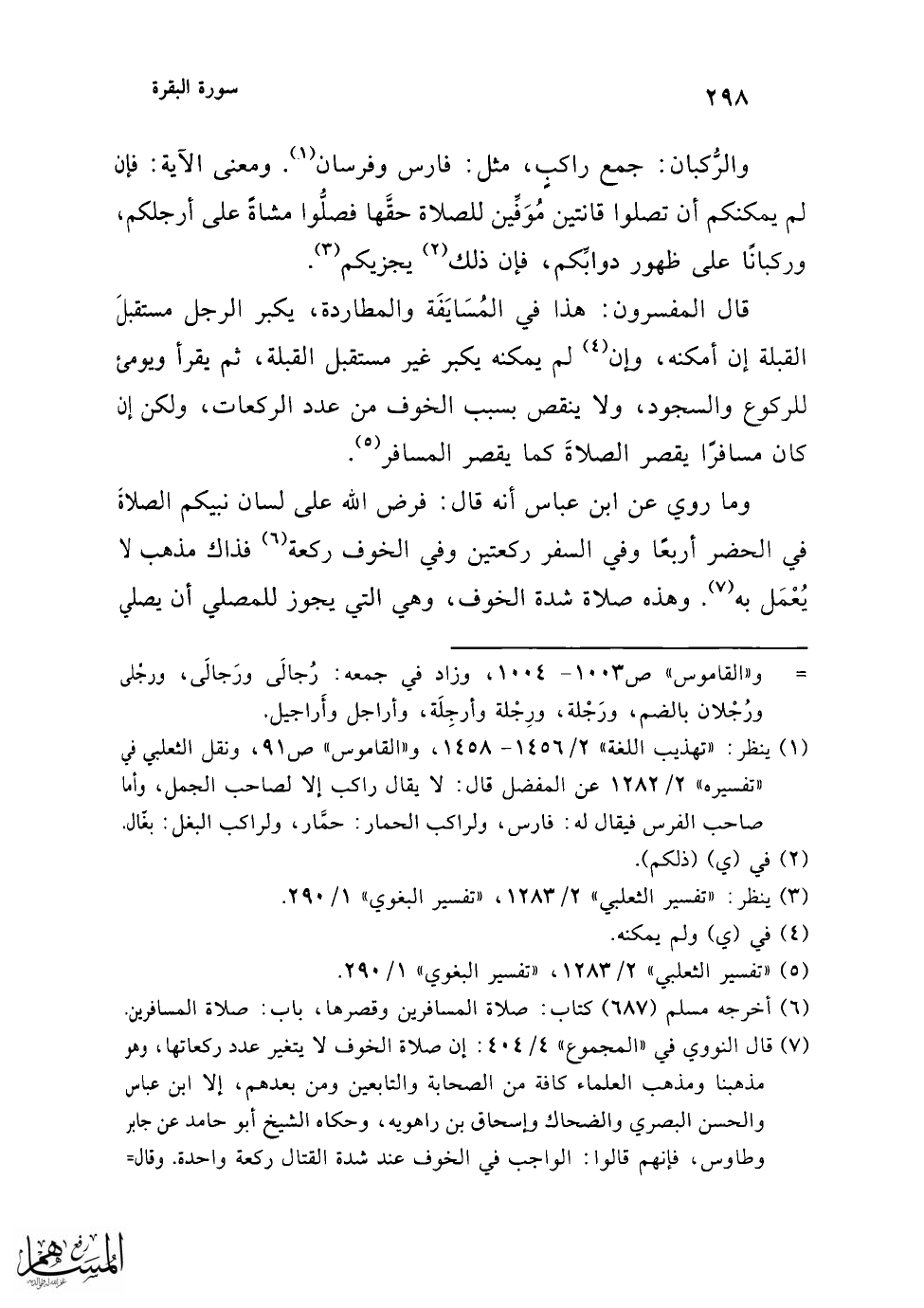 = البغوي في "تفسيره" 1/ 290: ولا ينتقص عدد الركعات بالخوف عند أكثر أهل العلم.