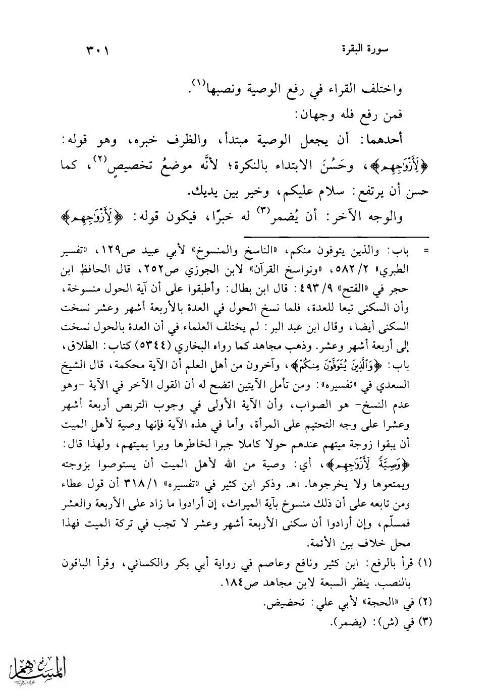 ومن نصب حمله على الفعل، أىِ: فليوصوا وصيةً، فتُنْصَب الوصيةُ على المصدر، ويكون قوله: {لَأَزْوَاجِهِم} وصفًا كما كان في قول من أضمر الخبر كذلك. ومن حجتهم: أن الظرف إذا تأخر عن (¬4) النكرة كان استعماله صفةً أكثر، وإذا كان خبرًا تقدم على النكرة، كقوله: {وَلَهُمْ أَعْمَالٌ} [المؤمنون: 63] {وَلَدَيْنَا مَزِيدٌ (35)} [ق: 35] فإذا تأخرت فالأكثر (¬5) فيها أن تكون صفات، وهاهنا تأخر الظرف، وهو قوله: {لَأَزْوَاجِهِم}، فالأحسن أن تكون صفة للنكرة لا خبرًا (¬6).