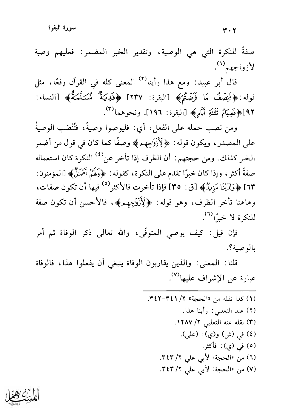 وجواب آخر: وهو أن هذه الوصية يجوز أن تكون مضافة إلى الله، بمعنى أمره وتكليفه، كأنه قيل: وصية من الله لأزواجهم، كقوله: {يُوصِيكُمُ اللَّهُ فِي أَوْلَادِكُمْ} [النساء: 11] وهذا المعنى إنما يحسن على قراءة من قرأ بالرفع (¬1).