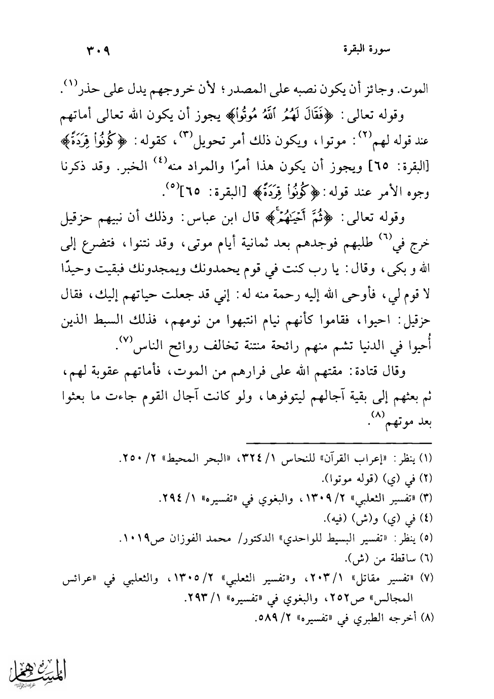 (¬2) ينظر: "تفسير الطبري" 2/ 591 - 592، "تفسير أبي المظفر السمعاني" 1/ 267، "تفسير الثعلبي" 2/ 1309، "تفسير البغوي" 1/ 194.