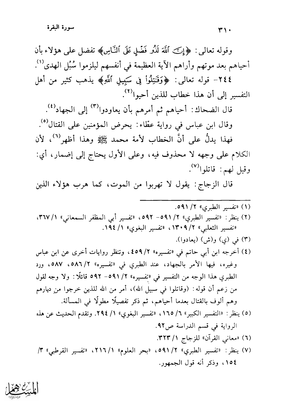 سمعتم خبرهم فلا ينفعكم الهرب (¬1). وقيل: إنه حث على الشكر بقوله: {إِنَّ اللَّهَ لَذُو فَضْلٍ عَلَى النَّاسِ وَلَكِنَّ أَكْثَرَهُمْ لَا يَشْكُرُونَ} كأنه قال: واشكروا وقاتلوا في سبيل الله.