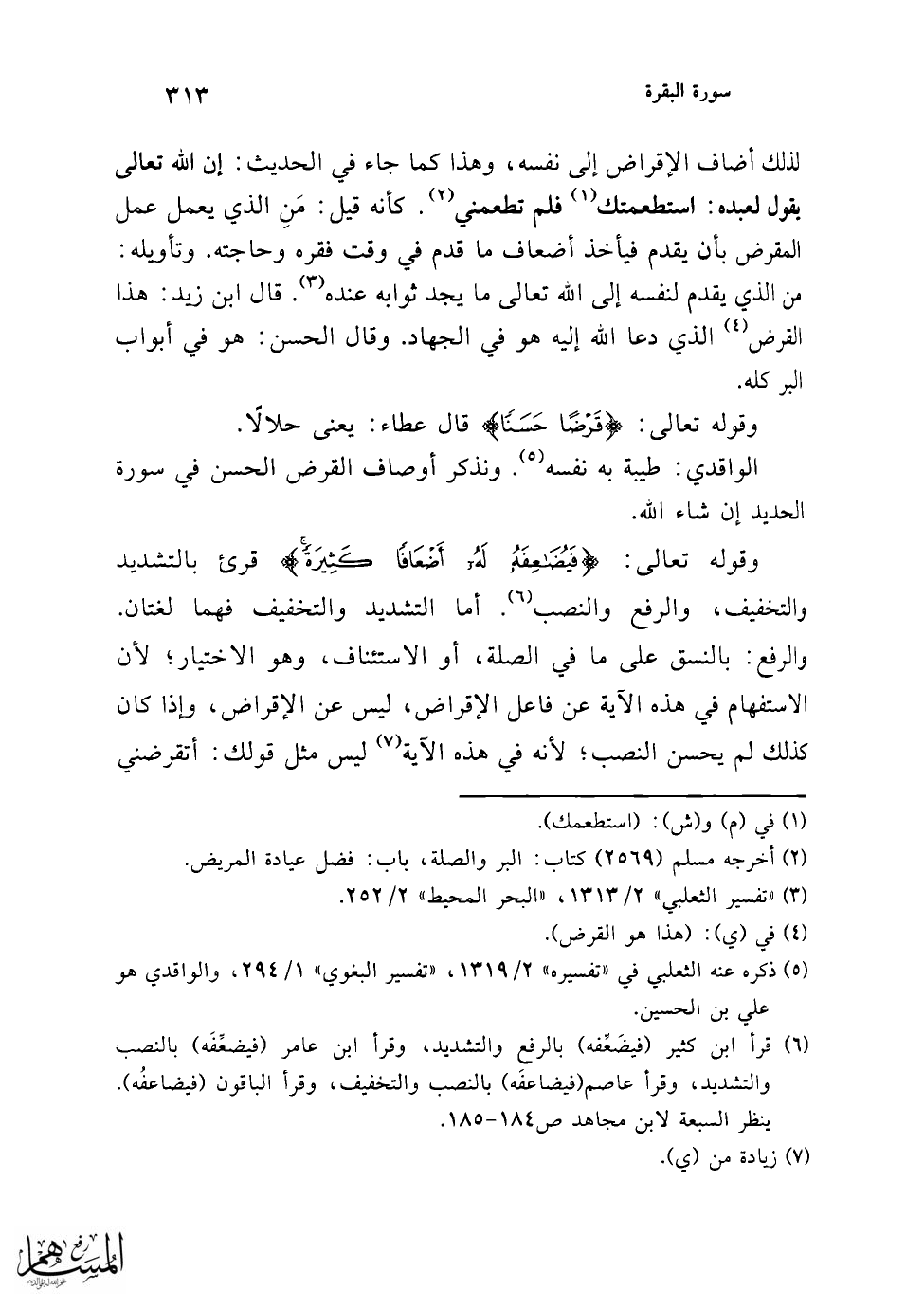فأما وجه النصب: فهو أن يحمل الكلام على المعنى لا على اللفظ؛ لأن المعنى: أيكون قرض فيضاعفه، كقراءة من قرأ: {مَنْ يُضْلِلِ اللَّهُ فَلَا هَادِيَ لَهُ وَيَذَرُهُمْ} (¬1) (¬2) [الأعراف: 186] جزم قوله: {وَيَذَرُهُم} لأن معنى قوله: {فَلَا هَادِيَ لَهُ} لا يهده (¬3). ونحو هذا كثير مما حُمِل الكلام فيه على المعنى دون اللفظ، قال الحسن والسدي: هذا التضعيف لا يعلمه إلا الله تعالى، و (هو) (¬4) مثل قوله: {وَيُؤْتِ مِنْ لَدُنْهُ أَجْرًا عَظِيمًا} [النساء: 40]، ومعنى التضعيف والإضعاف والمضاعفة واحد، وهو الزيادة على أصل الشيء حتى يصير مثلين أو أكثر (¬5).