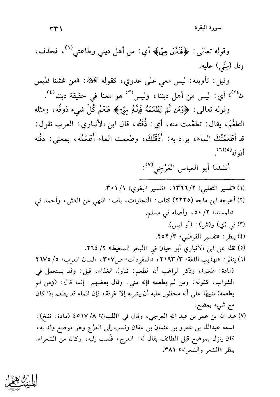 وقوله تعالى: {إِلَّا مَنِ اغْتَرَفَ غُرْفَةً بِيَدِهِ} الاغتراف: الأَخْذُ من الشيء باليدِ أو بآلة كما يُغْتَرَفُ من الماء. والمِغْرَفَةُ: الآلة التي يُغْرَفُ بها، وكذلك الغَرْفُ مثل الاغْتِرَاف (¬3).