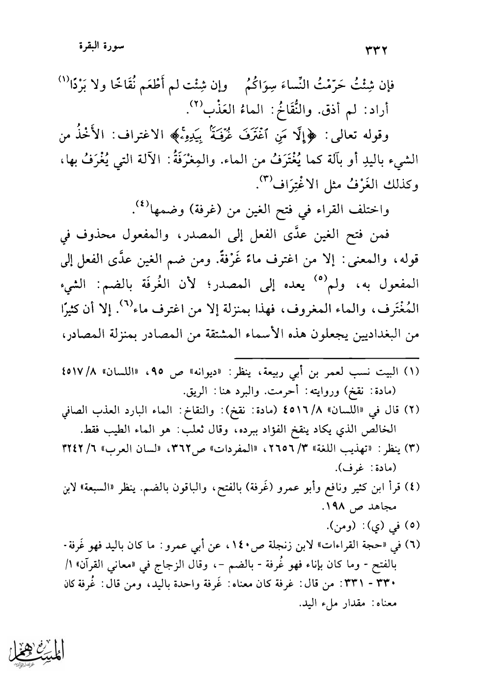 فعلى هذا يجوز أن ينتصب الغُرْفة، انتصاب الغَرْفَة. وزعم بعضهم (¬3) أن الاختيار الضم، لأنه لو جاء على معنى المصدر لمرة واحدة لكان (اغترافة) (¬4).