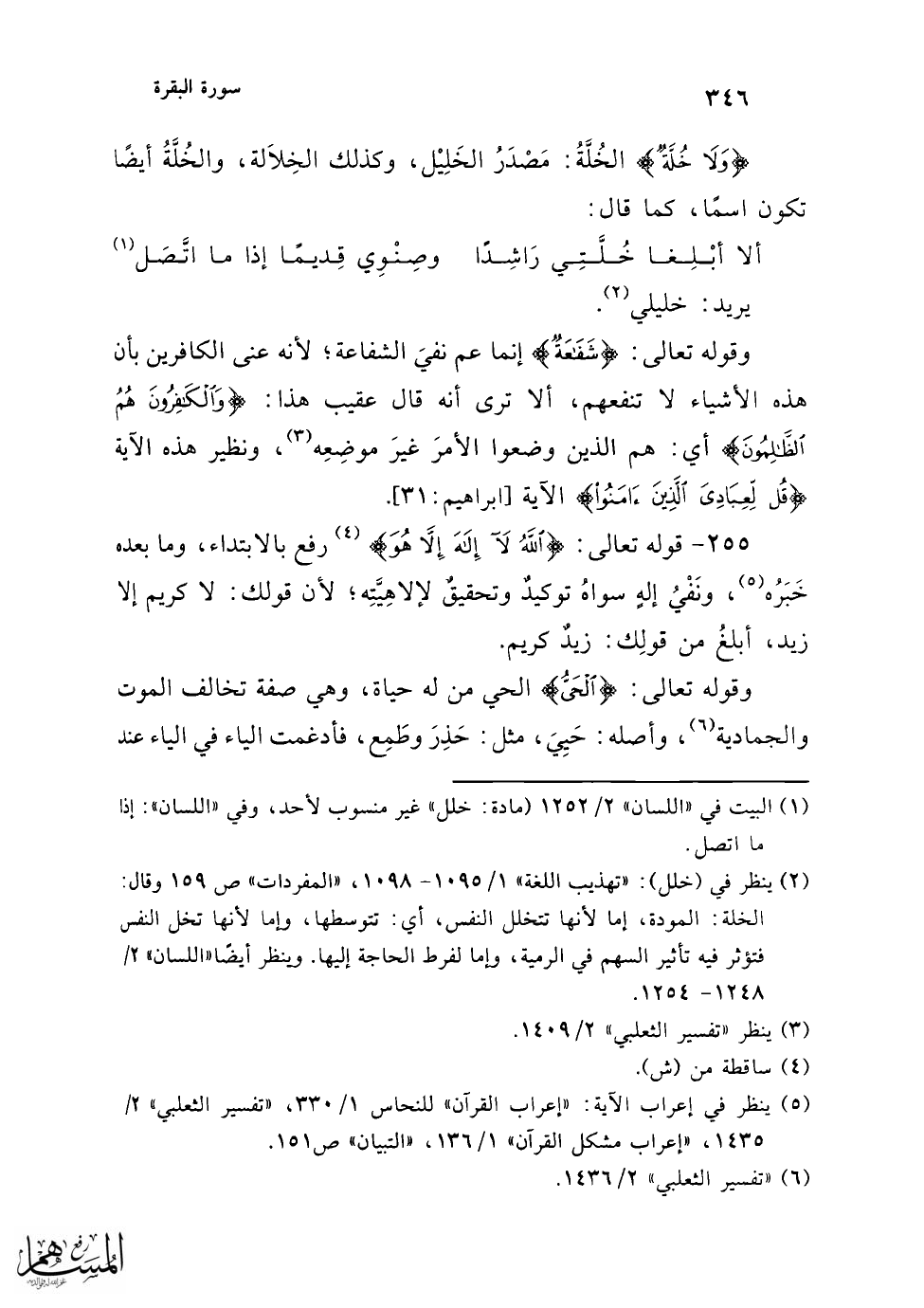 (¬7) "معاني القرآن" للفراء 1/ 190، وقال: وقرأها عمر بن الخطاب وابن مسعود (القيّام)، وصورة القيوم: فيعول، والقيام: الفيعال، وهما جميعًا مدح، وأهل الحجاز أكثر شيء قولًا: (الفيعال) من ذوات الثلاَثة، فيقولون للصوّاغ: الصيّاغ. اهـ. والقيم: قرأه علقمة، كما ذكر الثعلبي 2/ 1436.