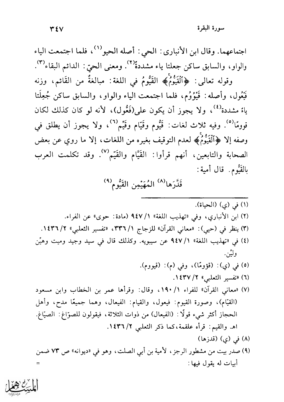 (¬2) ينظر في (القيوم): "معاني القرآن" للفراء 1/ 190، "معاني القرآن" للزجاج 1/ 336، "تهذيب اللغة" 9/ 356.