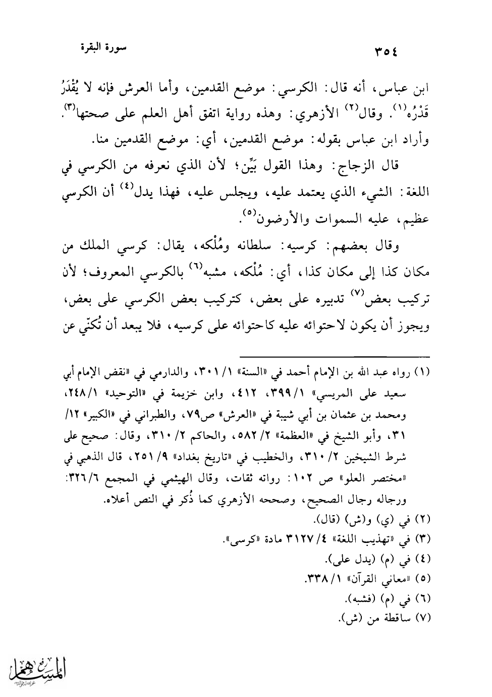 (¬4) رواه عبد الله بن الإمام أحمد في "السنة" 2/ 500، والطبري في "تفسيره" 3/ 9، و"ابن أبي حاتم" في "تفسيره" 2/ 490، وابن مندة في الرد على الجهمية 45، واللالكائي في "شرح أصول اعتقاد أهل السنة" 3/ 449، والبيهقي في "الأسماء والصفات" 2/ 272، كلهم من طريق جعفر بن أبي المغيرة عن سعيد بن جبير عن ابن عباس. قال الدارمي في نقضه على المريسي 1/ 411: وأما ما رَوَيْتَ عن ابن عباس فإنه من رواية جعفر، وليس جعفر ممن يعتمد على روايته إذا خالفه الرواة المتقنون. وقال ابن منده في "الرد على الجهمية" ص 45: ولم يتابع عليه جعفر، وليس هو بالقوى في سعيد بن جبير.