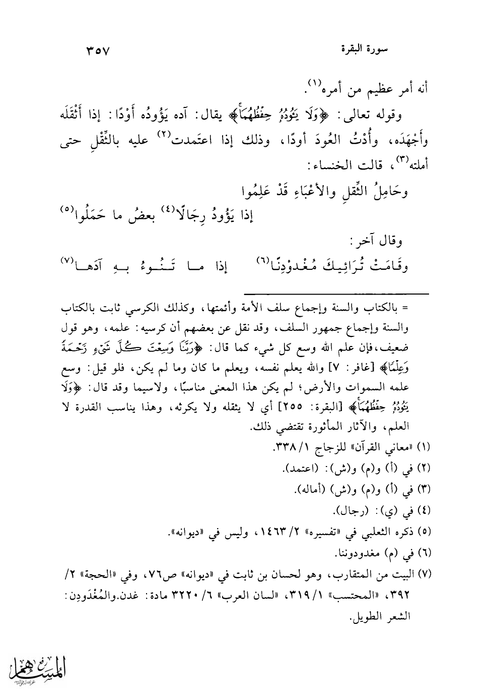 (¬1) ينظر في (آد): "تهذيب اللغة" 1/ 133، "المفردات" ص 43، "اللسان" 1/ 168، وقال ابن قتيبة في غريب القرآن ص 93: آده الشيء يؤوده، وآده يئيده، والوأد، الثِّقْل.