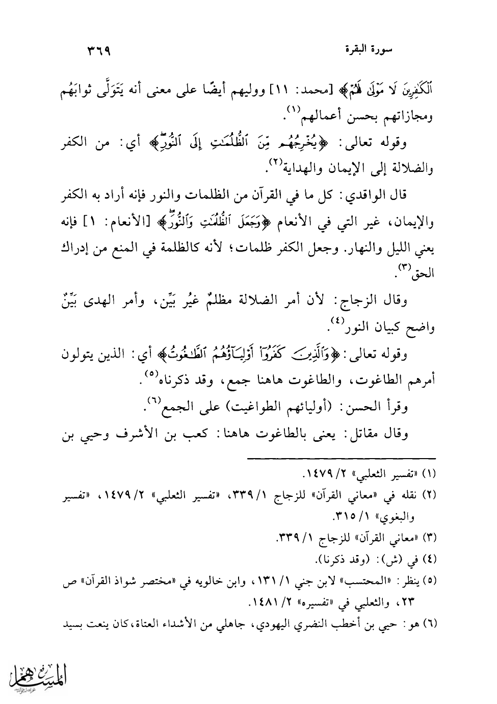 وقوله تعالى: {يُخْرِجُونَهُمْ مِنَ النُّورِ إِلَى الظُّلُمَاتِ} قال قتادة (¬3) والمقاتلان (¬4): يعنى: اليهود كانوا مؤمنين بمحمد - صلى الله عليه وسلم - قبل أن يبعث لِما يجدونه في كتبهم من نعته وصفته، فلما بعث جحدوه وأنكروه (¬5) وكفروا به. بيانه (¬6) قوله تعالى: {فَلَمَّا جَاءَهُمْ مَا عَرَفُوا كَفَرُوا بِهِ} [البقرة: 89] وعلى هذا، الطاغوتُ: علماؤهم، يخرجون أتباعهم عما كانوا عليه من الإيمان بمحمد قبل مبعثه، بقولهم: إنه ليس ذلك الذي نُعت (¬7) في كتابنا. وسائر المفسرين على أن هذا على العموم في جميع الكفار (¬8).