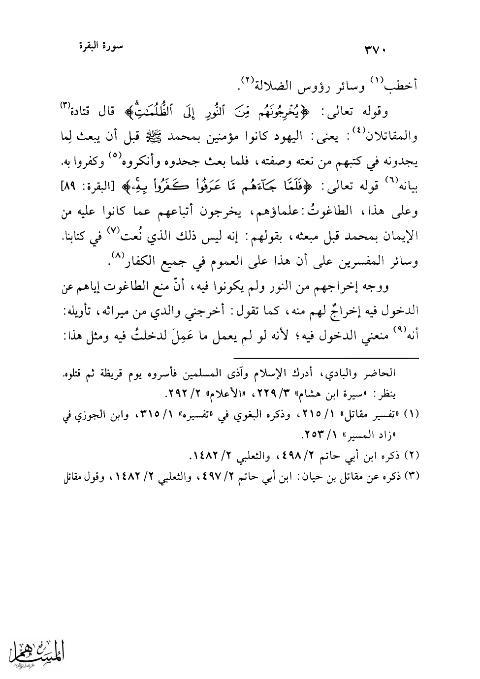 وأضاف الإضلال والإخراج من النور إلى الطاغوت؛ لأن سبب ذلك من الطاغوت، وهو التزيين والوسوسة والدعاء إليه، فالإضافة إليه لأجل السبب. وحقيقة الهداية والإضلال لله تعالى: {يُضِلُّ مَنْ يَشَاءُ وَيَهْدِي مَنْ يَشَاءُ} [النحل: 93] والشيطان يزين ويسول، كما قال النبي - صلى الله عليه وسلم -: "بعثت داعيًا وليس إليَّ من الهداية شيء، وخُلِقَ إبليسُ مُزِيِّنًا (¬3) وليس إليه من الضَّلالَةِ شيء" (¬4).
