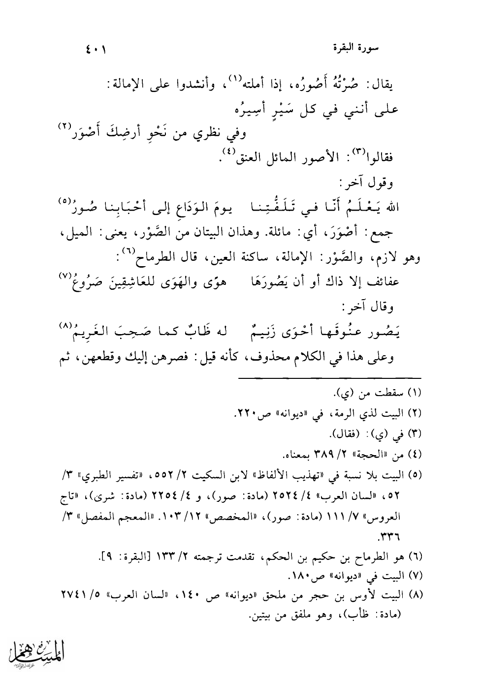 (¬4) ينظر: "معاني القرآن" للأخفش 1/ 183، "مجاز القرآن" 1/ 81، "معاني القرآن" للزجاج 1/ 345 - 346، "تهذيب اللغة" 2/ 1959 (مادة: صار)، "المفردات" ص 292.