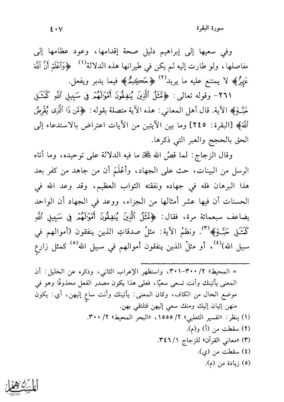 (¬1) "تفسير الثعلبي" 2/ 1558، "التبيان" ص 158، قال: وإنما قدر المحذوف لأن الذين ينفقون لا يشبهون بالحبة، بل إنفاقهم أو نفقتهم. "البحر المحيط" 2/ 303.