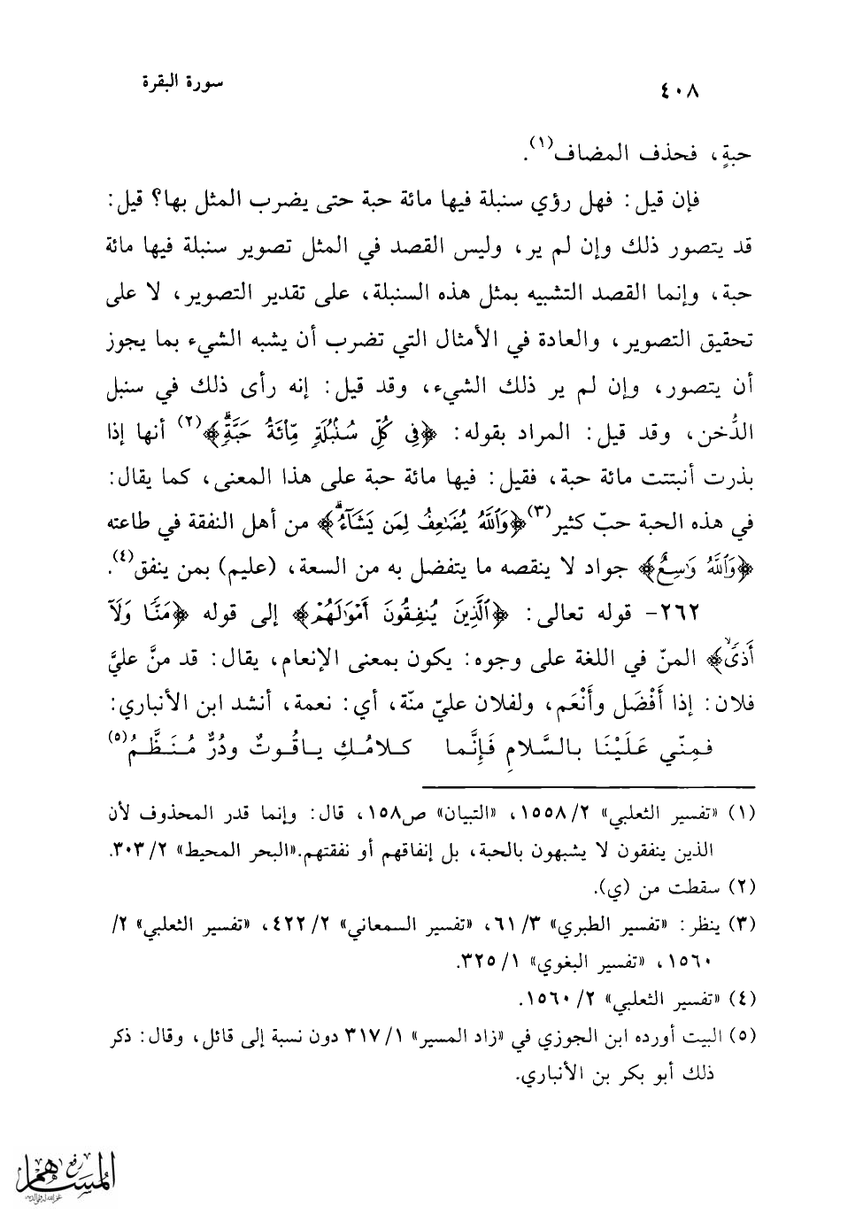 (¬3) ينظر في معاني المن: "تهذيب اللغة" 4/ 3459 - 3460 (مادة: منن)، "المفردات" 477، "لسان العرب" 7/ 4279، "عمدة الحفاظ" 4/ 131 - 132. وذكر الراغب أن المنة يراد بها: النعمة الثقيلة، ويقال ذلك على وجهين: أحدهما: أن يكون ذلك بالفعل، فيقال: منَّ فلان على فلان، إذا أثقله بالنعمة {لَقَدْ مَنَّ اللَّهُ عَلَى الْمُؤْمِنِينَ} وذلك على الحقيقة لا يكون إلا لله تعالى. والثاني: أن يكون ذلك بالقول، وذلك مستقبح فيما بين الناس إلا عند كفران النعمة، ويقبح ذلك، قيل: المنة تهدم الصنيعة, ولحسن ذكرها عند الكفران قيل: إذا كفرت النعمة حسنت=