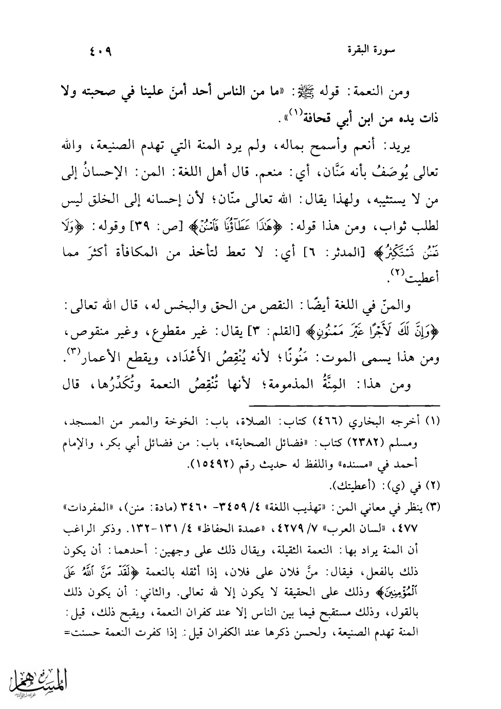= المنة، وقوله: {يَمُنُّونَ عَلَيْكَ أَنْ أَسْلَمُوا قُلْ لَا تَمُنُّوا عَلَيَّ إِسْلَامَكُمْ} [الحجرات: 17] فالمنة منهم بالقول، ومنة الله عليهم بالفعل وهو هدايته إياهم كما ذكر.