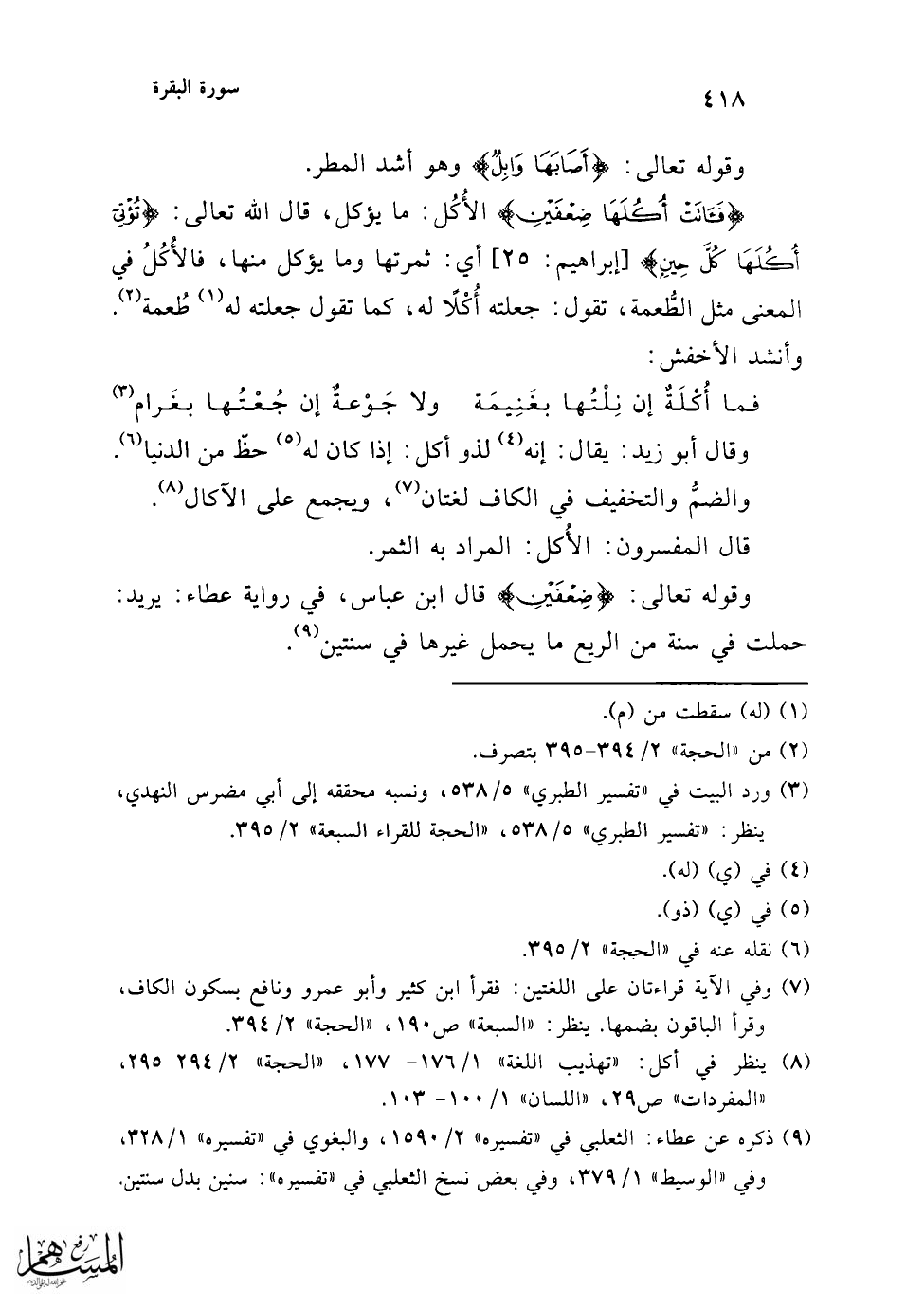 وتم المعنى عند قوله: {فَآتَتْ أُكُلَهَا ضِعْفَيْنِ} ثم زاد تأكيدًا وزيادة معنى فقال: {فَإِنْ لَمْ يُصِبْهَا وَابِلٌ} وأصابها طلٌّ فتلك حالها في الثراء وتضاعف الثمرة لا ينقص بالطل عن مقدارها بالوابل، وفي الكلام إضمار لا يتم المعنى إلا به، كأنه قيل: فإن لم يصبها وابل وأصابها طل فتلك حالها، فحذف لأن الباقي يدل عليه، تقول: كما أن هذه الجنة تثمر في كل حال ولا يخيب صاحبها، قلّ المطر أو كثر، كذلك يضعف (¬3) الله عز وجل ثواب صدقة المؤمن المخلص، سواء قلت نفقته وصدقته أم (¬4) كثرت (¬5).
