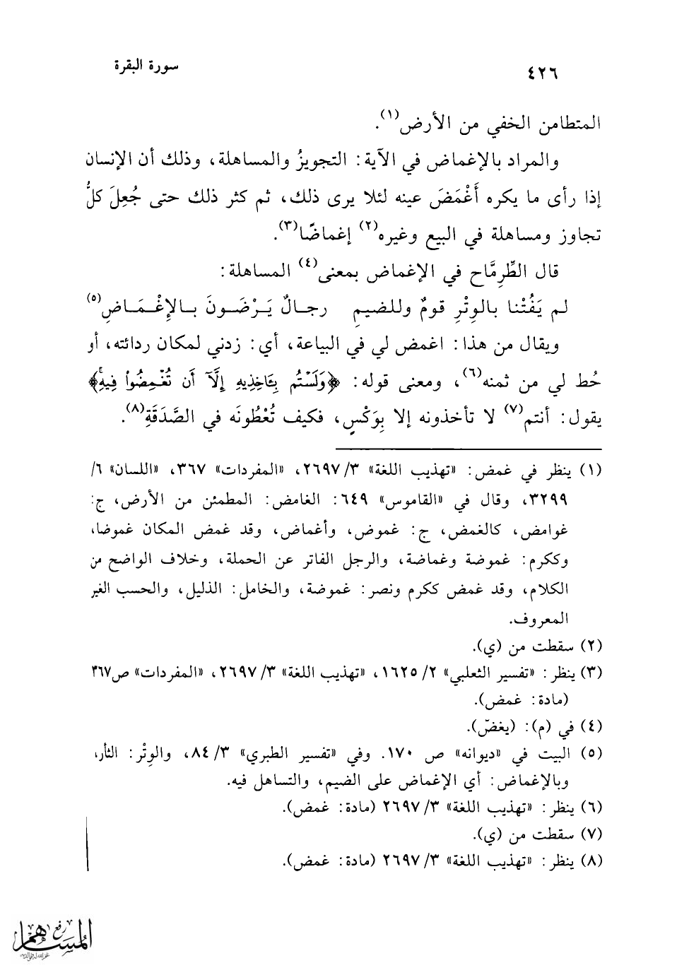 وقال في رواية الوالبي: ولستم بآخذي هذا الرديء بحساب الجيد حتى تحطوا من الثمن (¬2)، وبه قال الحسن (¬3) وقتادة (¬4)، وهذا القول يحمل على الإغماض إذا كان متعديًا إلى آخر، كما تقول: أغمضت بصر الميت وغَمَّضْتُه، كان المعنى: ولستم بآخذيه إلا إذا أغمضتم بصر البائع، يعني: أمرتموه بالإغماضِ والحطِّ من الثمن، فيكون المفعولُ محذوفًا في (¬5) هذا (¬6)، يدل على هذا المعنى: قراءة أبي مجلز {تُغْمِضُوا} فيه بضم التاء وفتح الميم (¬7) يعني: إلا أن يُهضم لكم.