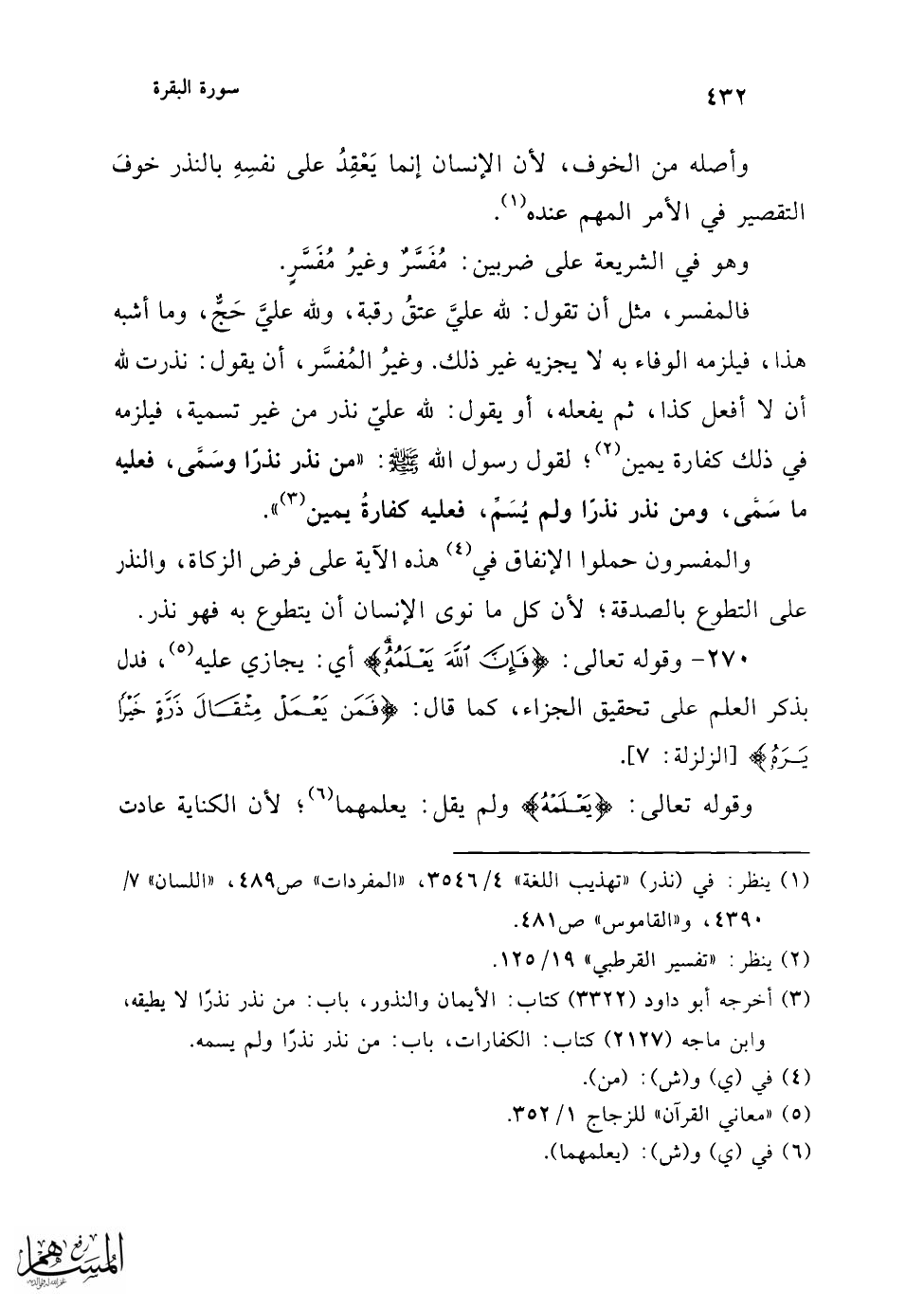 271 - قوله تعالى: {إِنْ تُبْدُوا الصَّدَقَاتِ فَنِعِمَّا هِيَ} الآية. فنعما نزلت لما سألوا رسول الله - صلى الله عليه وسلم -، فقالوا: صدقة السِّر أفضل أم صدقة (¬6) العلانيهَ؟ (¬7). والصدقة تطلق على الفرض والنفل، والزكاة لا تطلق إلا على الفرض.