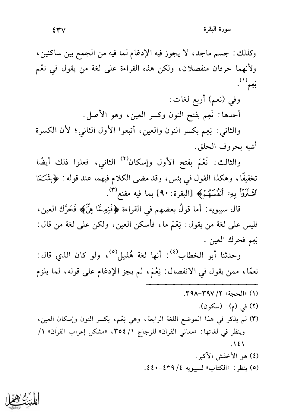 ولا يجوز أن يكون ممن يقول: نَعْم قبل الإدغام، كما أن من قرأ: {نِعِمَّا} لا يكون ممنْ قال قبل الإدغام نِعْمَ، ولكن قارئ الوجه الثالث ممن يقول: نَعِم، فجاء بالكلمة على أصلها (¬3).