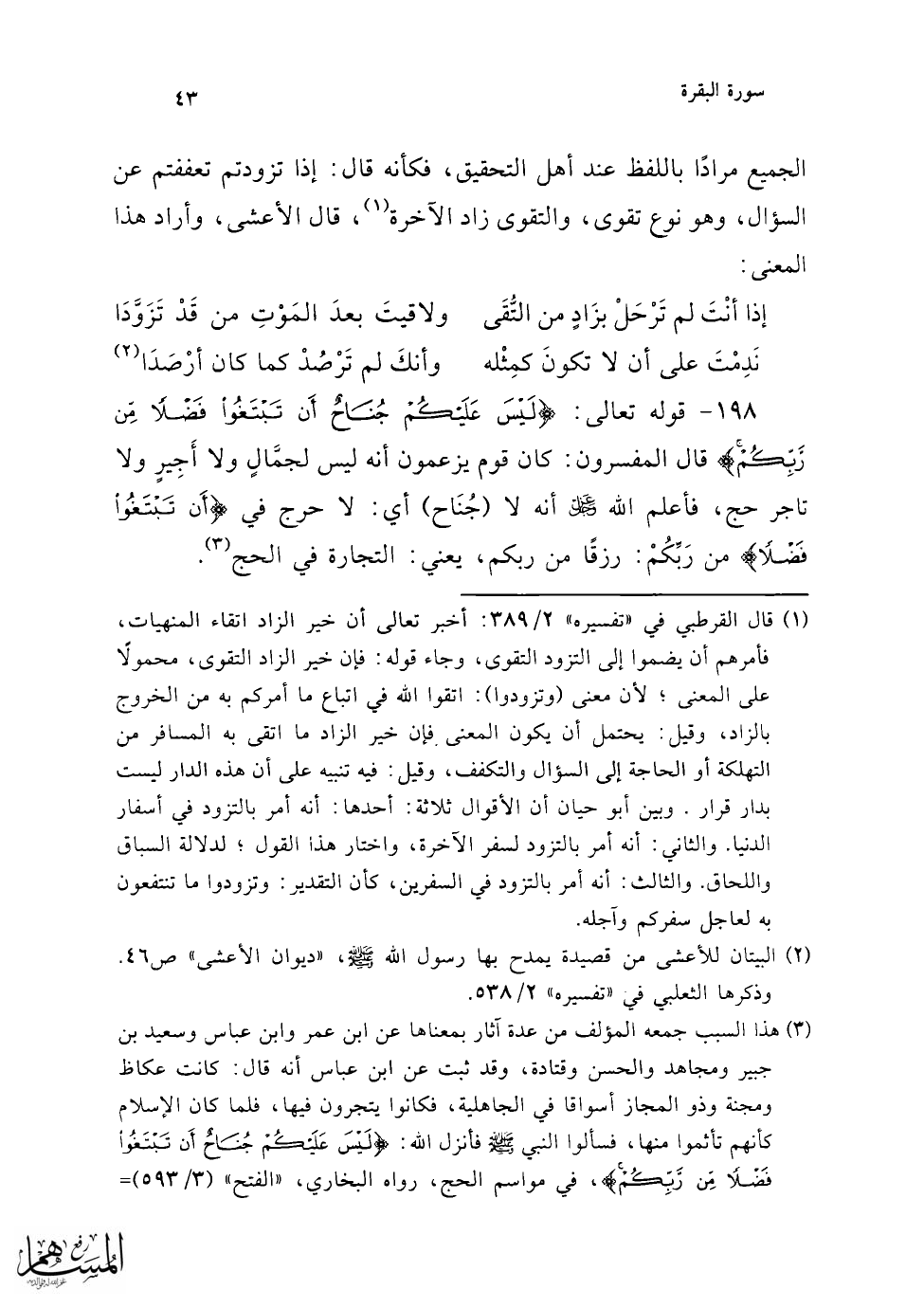 = في الحج، باب: التجارة أيام الموسم، والبيع في أسواق الجاهلية 2/ 239 برقم 1770، وأبو داود في المناسك، باب: الكرى 2/ 146 برقم 1734، والطبراني في "الكبير" 11/ 113، والطبري 2/ 285 وغيرهم، وثبت عن ابن عمر نحوه، رواه الأمام أحمد 2/ 155 برقم 6435 ط. شاكر. وصححه أحمد شاكر، وأبو داود، الموضع السابق حديث 1733، والحاكم 1/ 449 وصححه، والطبري 2/ 282 - 284، وفيه قال أبو أمامة التيمي: قلت لابن عمر: إنا قوم نكري فيزعمون أنه ليس لنا حج، فقال: ألستم تحرمون كما يحرمون، وتطوفون كما يطوفون، وترمون كما يرمون، قلت: بلى، قال: أنت حاج، جاء رجل إلى النبي - صلى الله عليه وسلم - فسأله عن الذي سألتني عنه فلم يدر ما يقول له حتى نزل جبريل عليه السلام بهذه الآية.