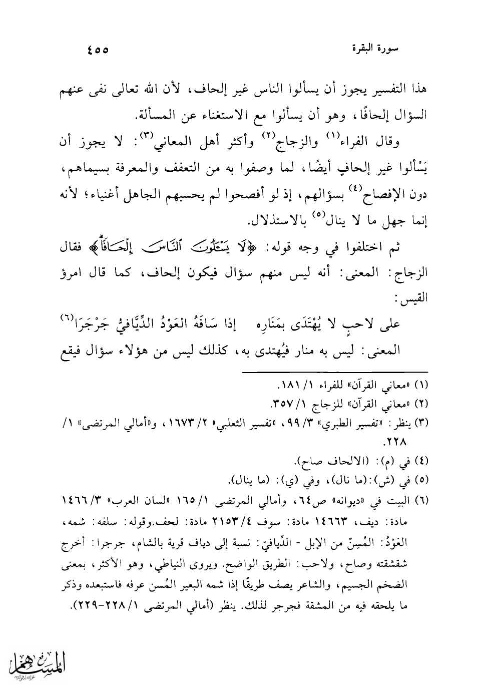 ونصر ابن الأنباري هذه الطريقة، وقال: تأويل الآية: لا يسألون ألبتة فيخرجهم السؤال في بعض الأوقات إلى الإلحاف، فجرى هذا مجرى قولك: فلان لا يُرجَى خيرُه، أي: ليس فيه خيرٌ ألبتة فَيُرْجَى، وأنشد قول امرئ القيس: