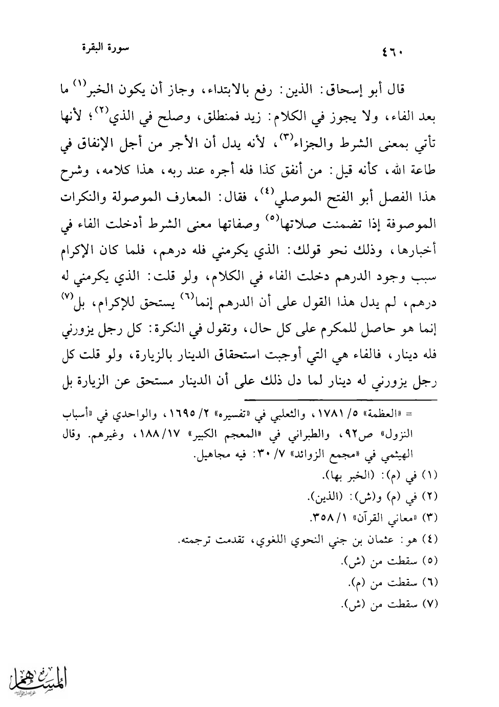 (¬2) ينظر: "معاني القرآن" للأخفش 1/ 187، "معاني القرآن" للزجاج 1/ 358، "تفسير الثعلبي" 2/ 1703، "مشكل إعراب القران" 1/ 142، "التبيان" ص 164، "البحر المحيط" 2/ 331.