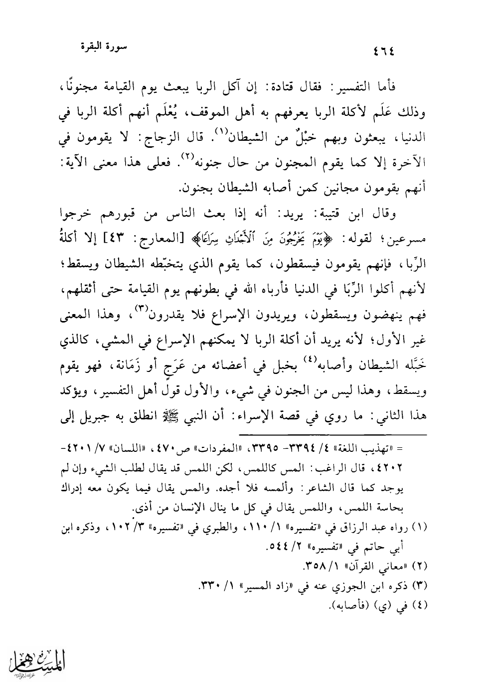 (¬2) يريد حديث أبي سعيد الخدري رواه عبد الرزاق في "تفسيره" 25/ 365، ومن طريقه رواه الطبري في "تفسيره" 15/ 11 والبيهقي في "دلائل النبوة" 2/ 390، والأصبهاني في "الترغيب والترهيب" 2/ 185، والثعلبي في "تفسيره" 2/ 1711، وفي إسناده أبو هارون العبدي متروك، وفي الباب: حديث أبي هريرة، رواه ابن ماجه (2273) كتاب: التجارات، باب: التغليظ في الربا، والإمام أحمد 2/ 353، وضعَّف إسناده ابن كثير في "تفسيره" 1/ 350، وقال البوصيري في "مصباح الزجاج" 2/ 23: هذا إسناد ضعيف لضعف علي بن زيد.