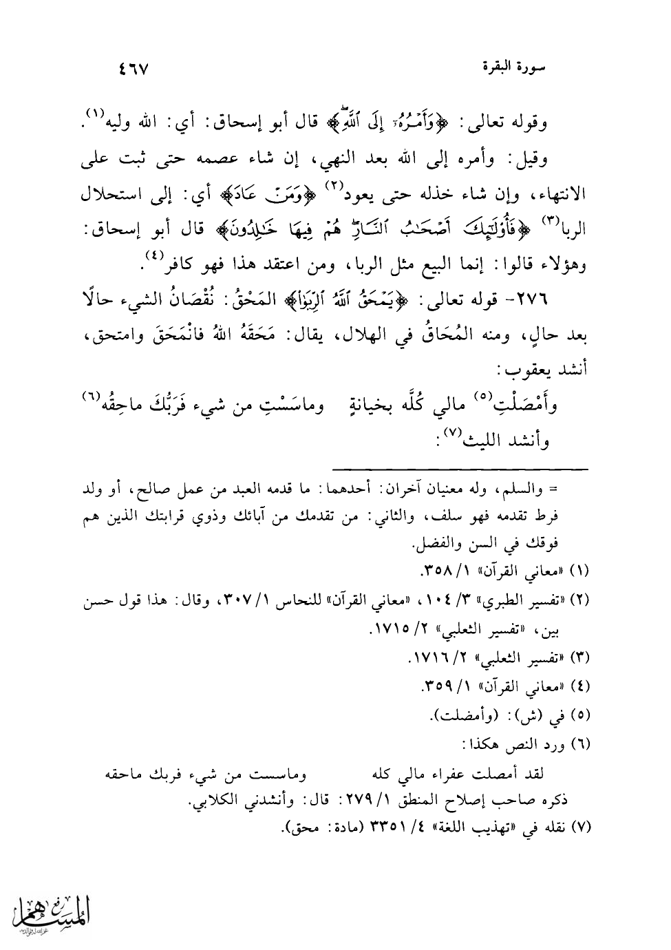 قال المفسرون: {يَمْحَقُ اللَّهُ الرِّبَا} أي: ينقصه ويذهب بركته، وإن كان كثيرًا، كما يُمْحِقُ القَمَرَ (¬6)، وقد روى ابن مسعود (¬7)، أن النبي - صلى الله عليه وسلم - قال "الربا وإن كثر فإن عاقبته إلى قُلِّ" (¬8).