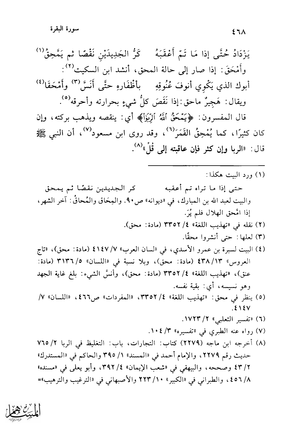 {وَيُرْبِي الصَّدَقَاتِ} قال في رواية عطاء: يريد: يُرَبِّي الصدقات لصاحبها (¬2) كما يُرَبي أحدُكُم فَصِيلَه (¬3).