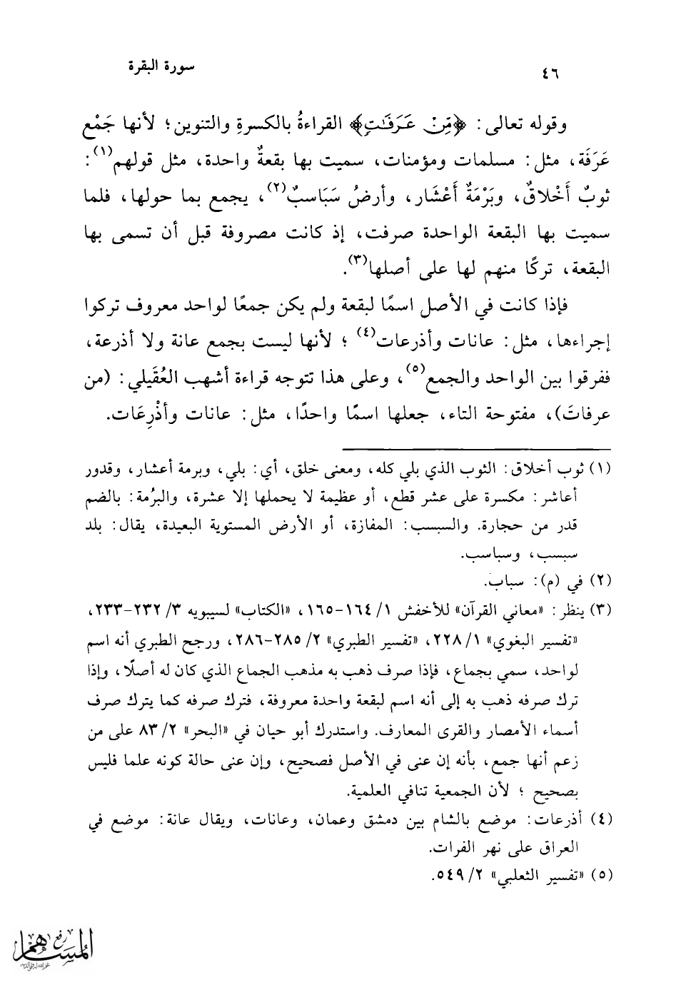 قال أبو إسحاق: في قوله: {مِنْ عَرَفَاتٍ} الوجه كسرها مع التنوين، وهي اسم لمكان واحد، ولفظه لفظ الجمع، والوجه فيه: الصرفُ عند جميع النحويين؛ لأنه بمنزلة الزيدين يستوي نصبُه وجَرُّه، وليس بمنزلة هاء التأنيث (¬1) (¬2).