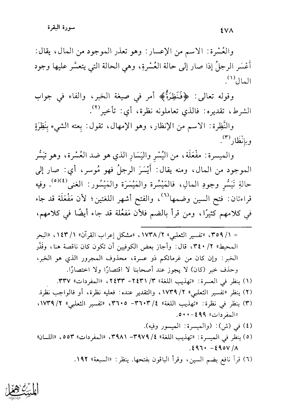 قال أبو إسحاق: من قرأ: (مَيْسُرِه) على الإضافة إلى الهاء فمخطئ، لأن مَيْسُر مَفْعُل، وليس في الكلام مَفْعُل، وزعم البصريون أنهم لا يعرفون مفْعُلًا (¬4).