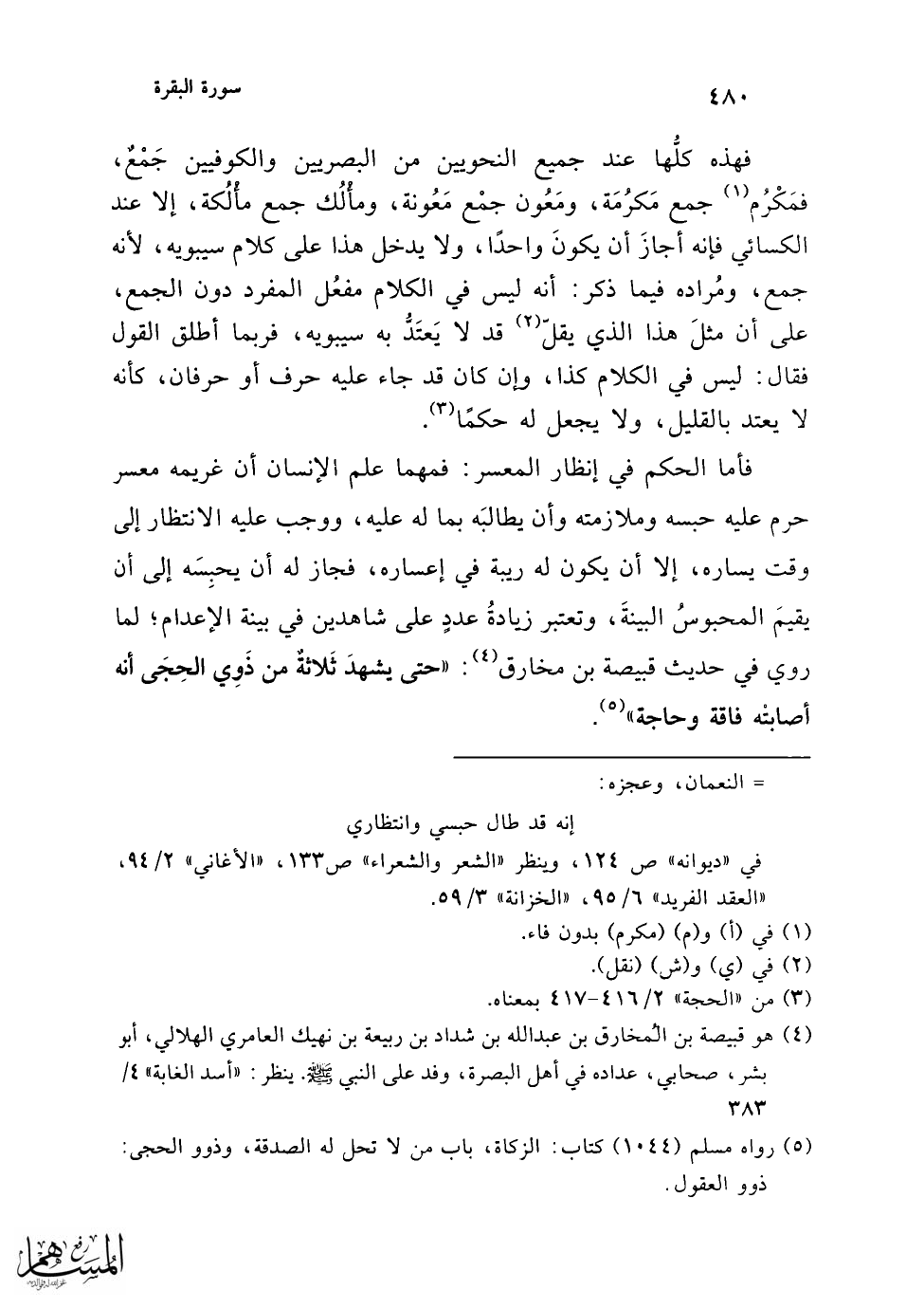 وقوله تعالى: {وَأَنْ تَصَدَّقُوا خَيْرٌ لَكُمْ إِنْ كُنْتُمْ تَعْلَمُونَ} أعلم الله تعالى أن الصدقة برأس المال على المعسر خير وأفضل، والمراد: وأن تصدقوا على المعسر برأس المال خيرٌ لكم، ولكنه حذف للعلمِ به، لأنه قد جرى ذكرُ المعسر وذكرُ رأسِ المال، فعلم أن التصدقَ راجعٌ إليهما.