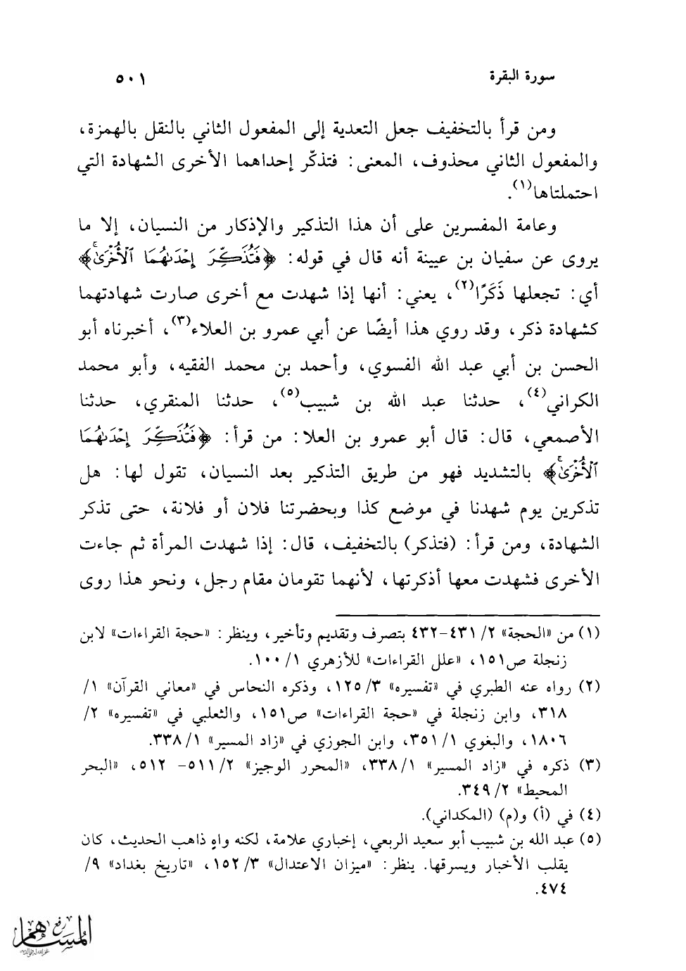 وأنكر المفسرون هذا التفسير، وضعّفوه، من حيث إن النساءَ لو بلغن ما بلغن ولم يكن معهن رجل لم تجز شهادتهن حتى يكون معهنَّ رَجُل، فإذا كان الأمر على هذا لم تُذْكِرْها، والحاجة في نفاذ الشهادة إلى الرجل قائمة، ومما يبعد هذا التفسير: أن الضلال في قوله: {تُضِلَّ إِحْدَاهُمَا} فسر بالنسيان، والذي (¬1) ينبغي أن يعادله ما هو مقابل للنسيان من التذكير، وأيضًا فإن المرأة إذا انضمت إلى المرأة لو صيرتها ذكرًا لكانت شهادة المرأتين بمنزلة شهادة رجل في جميع الأحكام (¬2).
