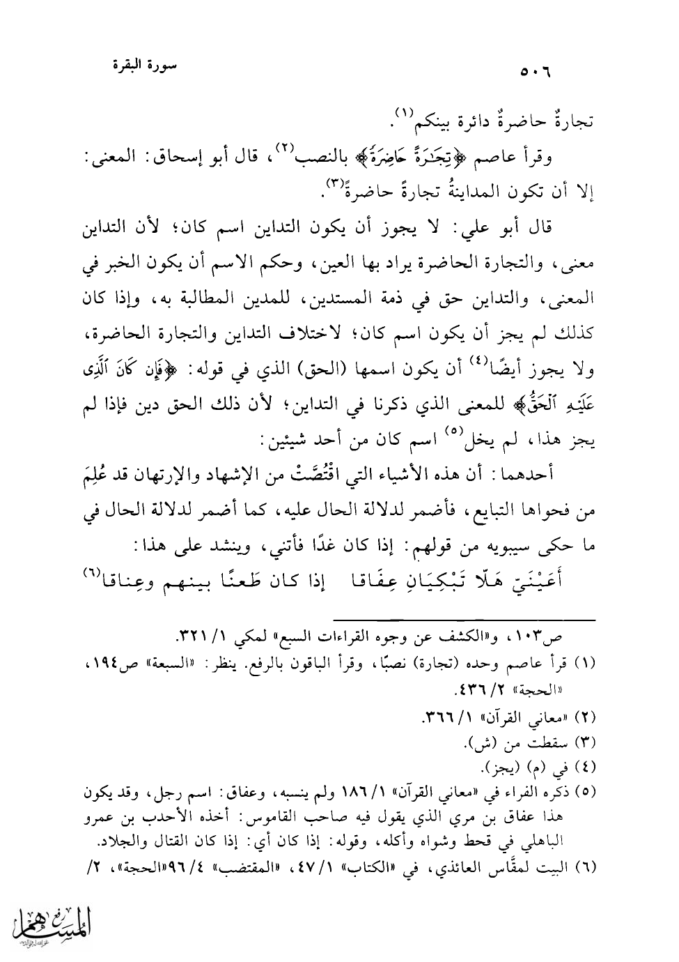 (¬2) من "الحجة" 2/ 440 بتصرف، والبيت الأول: أعيني هلا تبكيان، لم يذكره في "الحجة".