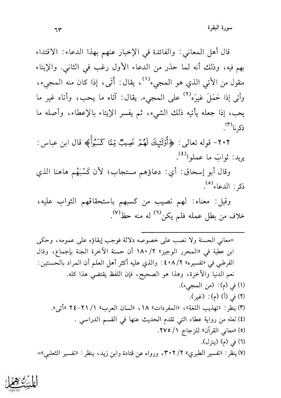= 2/ 601، "التفسير الكبير" 5/ 205، وكلا القولين اللذين ذكرهما (المصنف) على اعتبار أن أولئك عائدة للصنف الثاني، وهم المؤمنون، وهذا اختيار الطبري في "تفسيره" 2/ 301، ودليله: أنه قال في حق الصنف الأول: {وَمَا لَهُ فِي الْآخِرَةِ مِنْ خَلَاقٍ}، فذكر جزائهم، ثم ذكر الصنف الثاني، وهذا جزاؤهم. ينظر: "التفسير الكبير" 5/ 205،"الدر المصون" 2/ 343، وقيل: إن أولئك تعود إلى الفريقين مثل قوله: {وَلِكُلٍّ دَرَجَاتٌ مِمَّا عَمِلُوا} [الأحقاف: 19].