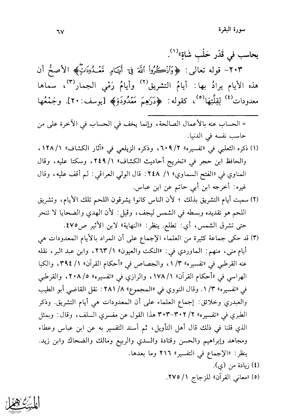 (¬1) "معاني القرآن" للزجاج 1/ 275، قال القرطبي في "تفسيره" 3/ 1: قال الكوفيون: الألف والتاء في (معدودات)؛ لأقل العدد، وقال البصريون: هما للقليل والكثير.